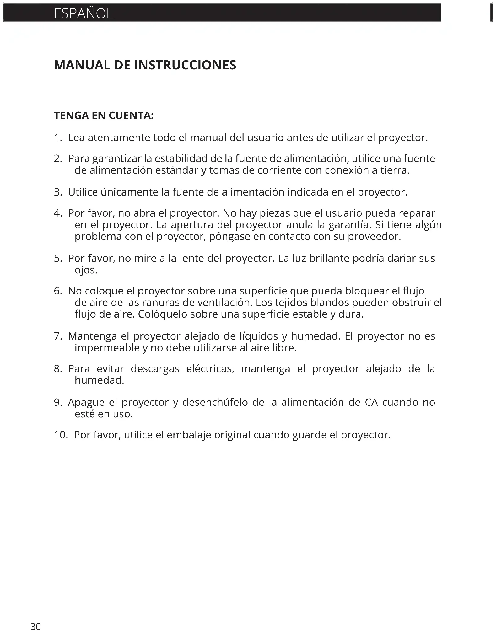 10. Por favor, utilice el embalaje original cuando guarde el proyector.31