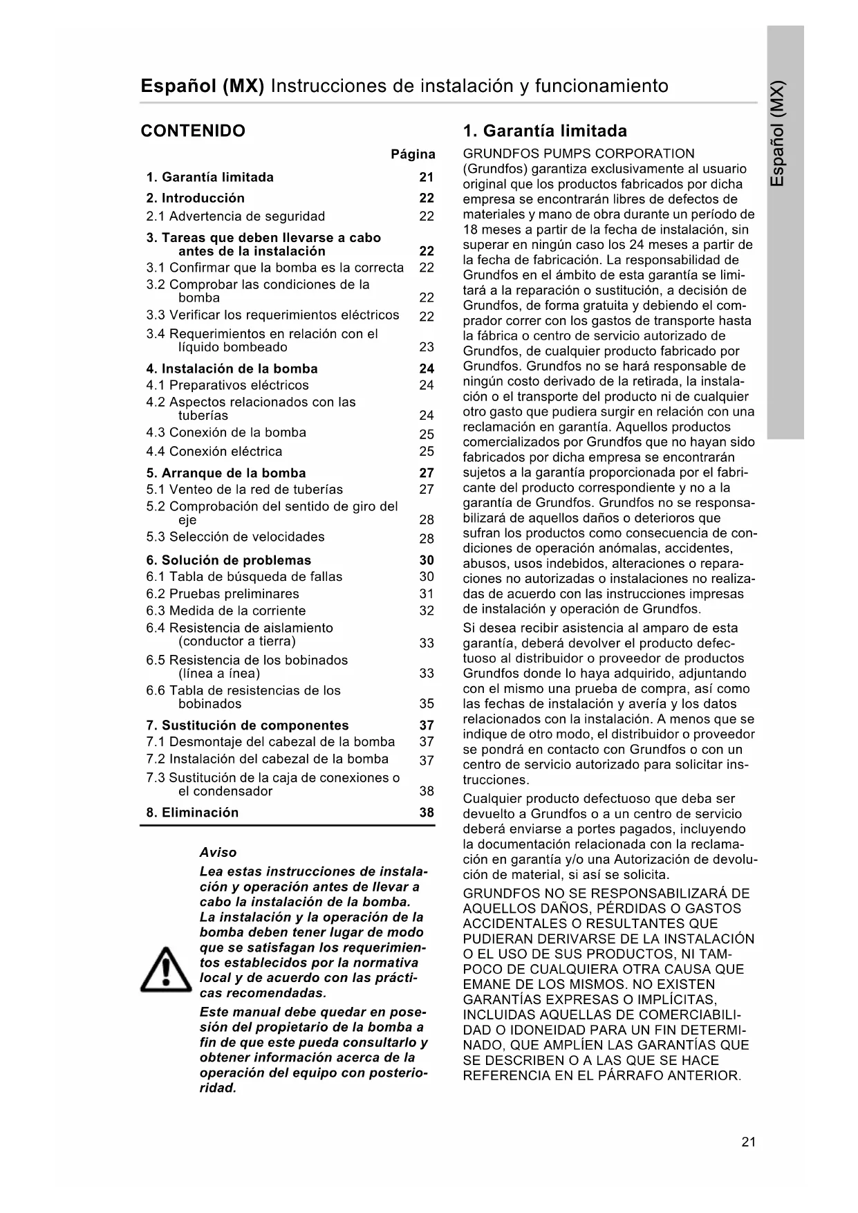 Aviso Lea estas instrucciones de instala- ción y operación antes de llevar a cabo la instalación de la bomba. La instalación y la operación de la bomba deben tener lugar de modo que se satisfagan los requerimien- tos establecidos por la normativa local y de acuerdo con las prácti- cas recomendadas. Este manual debe quedar en pose- sión del propietario de la bomba a fin de que este pueda consultarlo y obtener información acerca de la operación del equipo con posterio- ridad. UPS_Series 200_US.book Page 21 Monday, June 18, 2012 3:52 AM22 Español (MX) Ciertas jurisdicciones no admiten la exclusión o limitación de los daños accidentales o resultan- tes; otras rechazan la imposición de limitaciones en cuanto a la duración de las garantías implíci- tas. Es posible, por tanto, que las limitaciones o exclusiones anteriores no le sean de aplicación. Esta garantía le confiere derechos legales espe- cíficos. Puede que disponga de otros derechos en virtud de su jurisdicción.