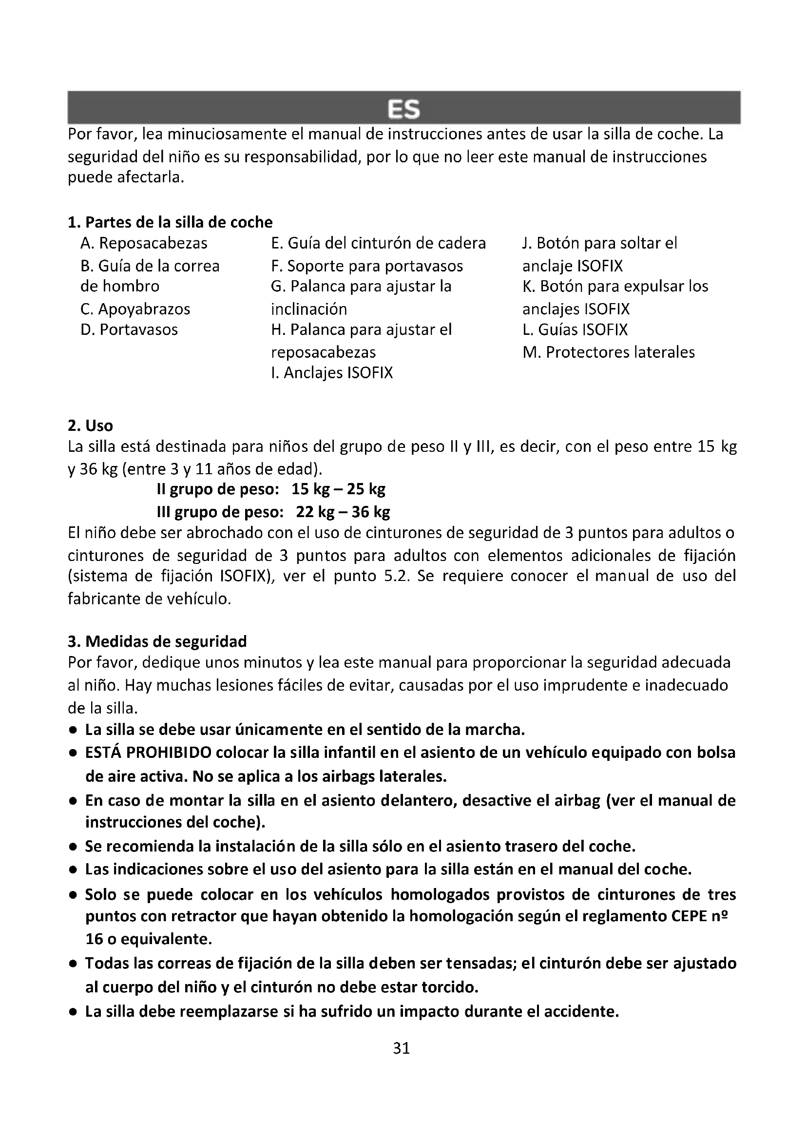 Por favor, dedique unos minutos y lea este manual para proporcionar la seguridad adecuada al niño. Hay muchas lesiones fáciles de evitar, causadas por el uso imprudente e inadecuado de la silla. ● La silla se debe usar únicamente en el sentido de la marcha. ● ESTÁ PROHIBIDO colocar la silla infantil en el asiento de un vehículo equipado con bolsa de aire activa. No se aplica a los airbags laterales. ● En caso de montar la silla en el asiento delantero, desactive el airbag (ver el manual de instrucciones del coche). ● Se recomienda la instalación de la silla sólo en el asiento trasero del coche. ● Las indicaciones sobre el uso del asiento para la silla están en el manual del coche. ● Solo se puede colocar en los vehículos homologados provistos de cinturones de tres puntos con retractor que hayan obtenido la homologación según el reglamento CEPE nº 16 o equivalente. ● Todas las correas de fijación de la silla deben ser tensadas; el cinturón debe ser ajustado al cuerpo del niño y el cinturón no debe estar torcido. ● La silla debe reemplazarse si ha sufrido un impacto durante el accidente.32 ● La silla no debe modificarse. ● La silla debe protegerse contra la luz solar directa para evitar quemaduras del niño. ● Nunca deje al niño en la silla sin vigilancia. ● Preste atención a que el equipaje y otros artículos estén bien asegurados, en particular, en el estante debajo de la ventana trasera, porque en caso de una colisión pueden causar lesiones. ● La silla no puede usarse sin el tapizado. ● No se debe usar el tapizado de cambio, distinto del recomendado por el fabricante, porque éste forma parte integral del sistema de seguridad de la silla. ● Se recomienda guardar el manual de instrucciones de la silla durante todo el período de su uso. ● No se deben utilizar otros puntos de fijación que los descritos en el manual y los marcados en la silla. ● Todos los elementos duros y de plástico de la silla deben colocarse e instalarse de tal manera que, en condiciones normales de explotación del vehículo, no queden atrapados por el asiento deslizante o la puerta del vehículo. ● Se debe comprobar regularmente el estado técnico del arnés de seguridad, prestando atención particular a los puntos de fijación, las costuras y los elementos de ajuste. ● No se deberá usar la silla si sus partes han sufrido un daño o están flojas después de un accidente. ● En caso de una situación de emergencia, es importante desabrochar rápido el cinturón de seguridad. Esto significa que el botón de liberación del cinturón no está totalmente protegido, asegúrese de que su hijo sabe que no debe jugar con la hebilla. ● No utilice la silla en casa. La silla no es adecuada para el uso doméstico y debe utilizarse sólo durante el viaje en coche. ● La parte trasera del respaldo de la silla debe apoyarse libremente sobre el respaldo del asiento del coche. Preste atención a que a través del reposacabezas del coche no haya un espacio no deseado entre el respaldo de la silla y el respaldo del asiento del vehículo. Algunos reposacabezas de automóviles son un obstáculo para la instalación de la silla de coche y por lo tanto deben ser desmontados primero. ● La hebilla del cinturón de seguridad para adultos no puede estar demasiado cerca de la parte inferior del apoyabrazos de la silla. En caso de dudas acerca de este punto, póngase en contacto con el fabricante de la silla. ● Usted debe darle a su hijo un buen ejemplo y siempre ponerse el cinturón. El peligro para el niño también puede ser un adulto no abrochado con el cinturón de seguridad. ● Antes de cada viaje, asegúrese de que la silla está bien fijada. ● Fije la silla incluso cuando no está en uso. La silla no asegurada puede causar lesión de los pasajeros incluso en caso de un frenado de emergencia.33