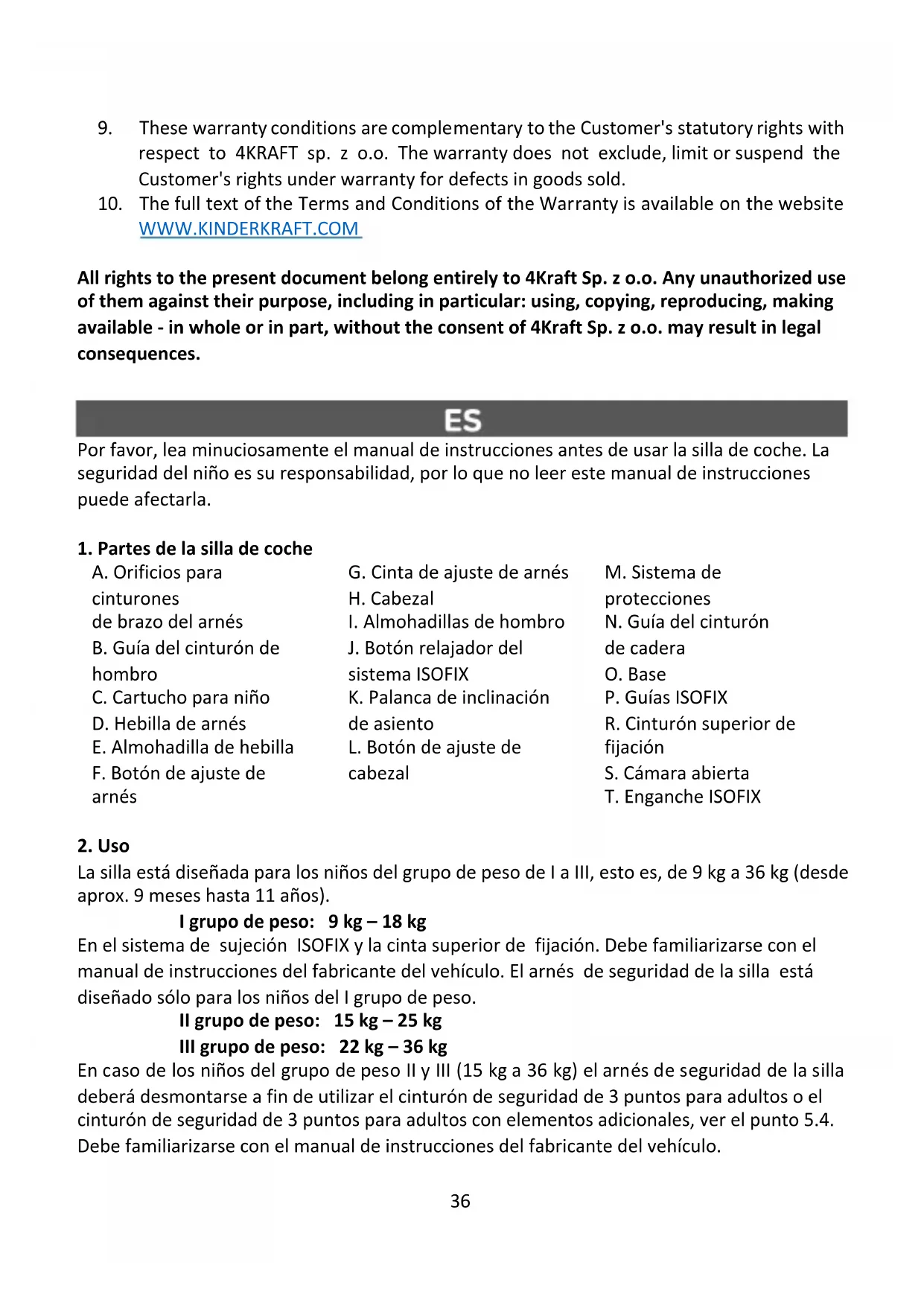 La silla está diseñada para los niños del grupo de peso de I a III, esto es, de 9 kg a 36 kg (desde aprox. 9 meses hasta 11 años). I grupo de peso: 9 kg – 18 kg En el sistema de sujeción ISOFIX y la cinta superior de fijación. Debe familiarizarse con el manual de instrucciones del fabricante del vehículo. El arnés de seguridad de la silla está diseñado sólo para los niños del I grupo de peso. II grupo de peso: 15 kg – 25 kg III grupo de peso: 22 kg – 36 kg En caso de los niños del grupo de peso II y III (15 kg a 36 kg) el arnés de seguridad de la silla deberá desmontarse a fin de utilizar el cinturón de seguridad de 3 puntos para adultos o el cinturón de seguridad de 3 puntos para adultos con elementos adicionales, ver el punto 5.4. Debe familiarizarse con el manual de instrucciones del fabricante del vehículo.37