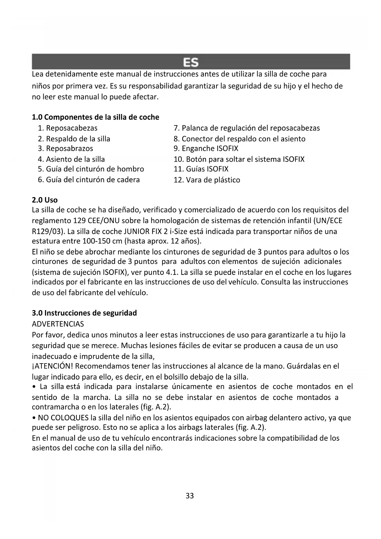 La silla de coche se ha diseñado, verificado y comercializado de acuerdo con los requisitos del reglamento 129 CEE/ONU sobre la homologación de sistemas de retención infantil (UN/ECE R129/03). La silla de coche JUNIOR FIX 2 i-Size está indicada para transportar niños de una estatura entre 100-150 cm (hasta aprox. 12 años). El niño se debe abrochar mediante los cinturones de seguridad de 3 puntos para adultos o los cinturones de seguridad de 3 puntos para adultos con elementos de sujeción adicionales (sistema de sujeción ISOFIX), ver punto 4.1. La silla se puede instalar en el coche en los lugares indicados por el fabricante en las instrucciones de uso del vehículo. Consulta las instrucciones de uso del fabricante del vehículo.