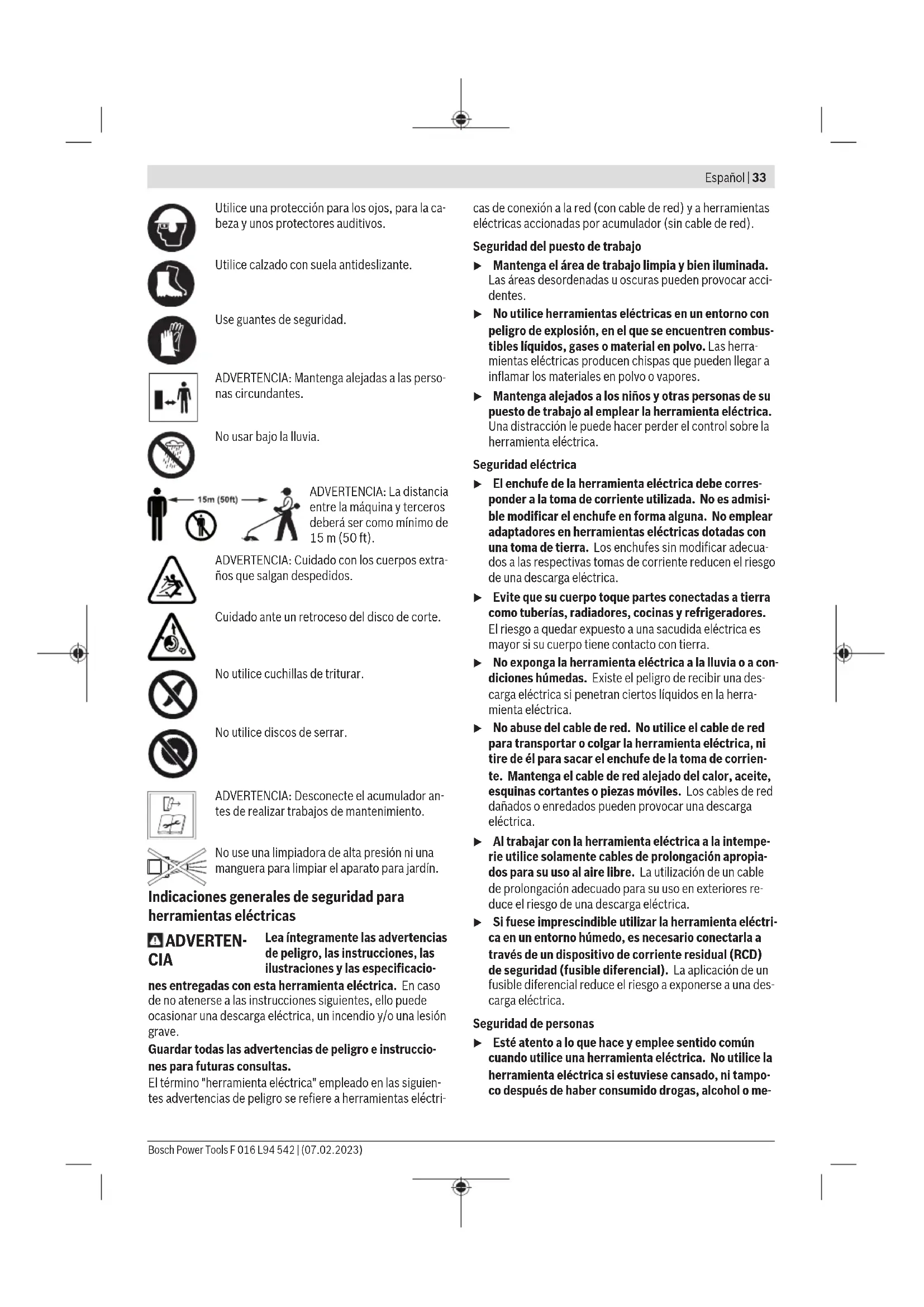 Los accesorios descritos e ilustrados no corresponden al material que se adjunta de serie. La gama completa de acce- sorios opcionales se detalla en nuestro programa de acceso- rios. Bosch Power Tools F 016 L94 542 | (07.02.2023)38 | Español Datos técnicos Cortabordes/desbrozadora GRT 18V-33 GFR 18V-23 Nº de art. 3 600 HD0 0.. 3 600 HD1 0.. Tensión nominal