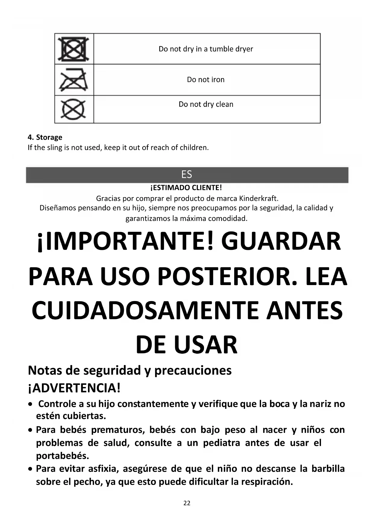 - Para bebés prematuros, bebés con bajo peso al nacer y niños con problemas de salud, consulte a un pediatra antes de usar el portabebés.