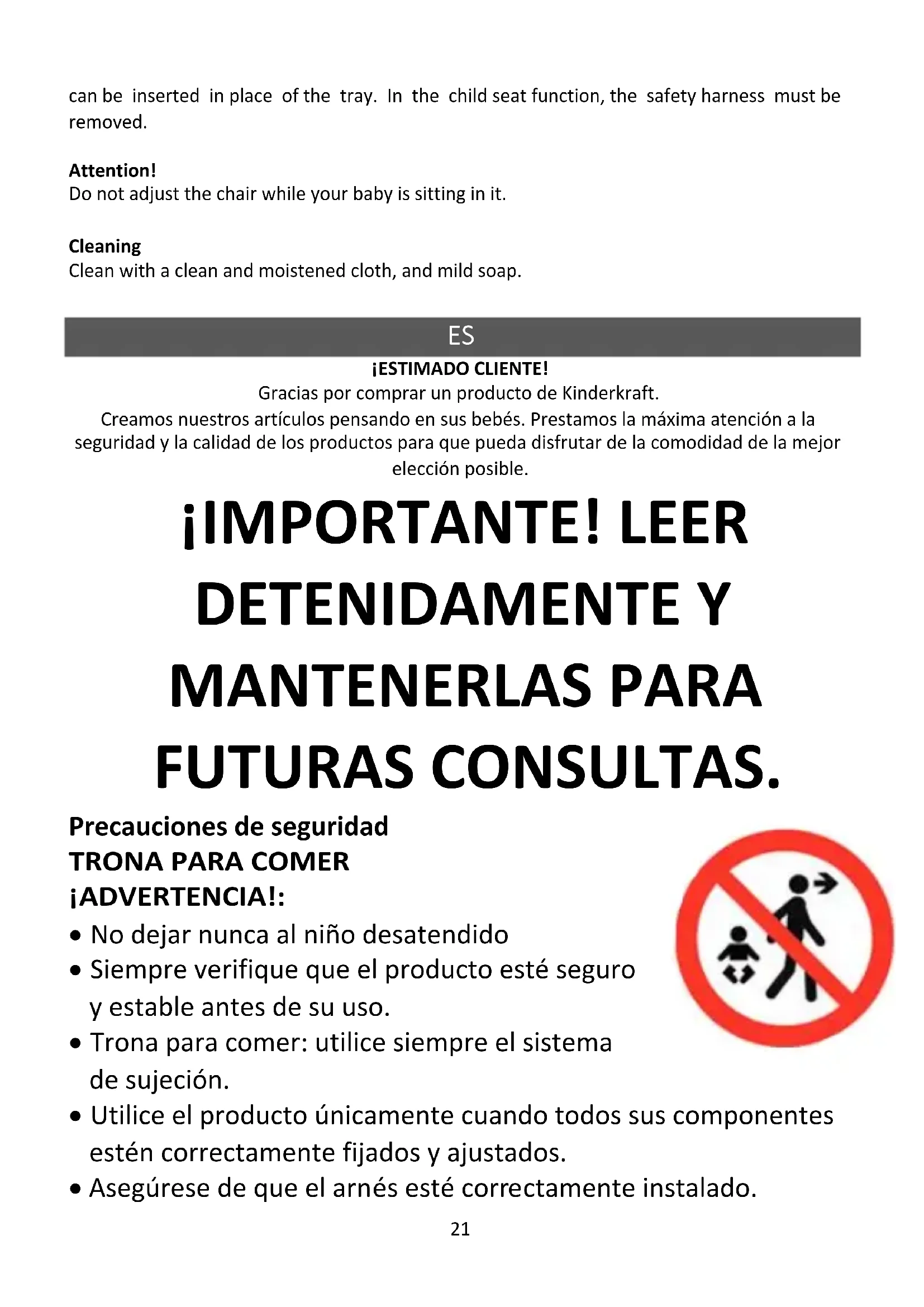 ¡ESTIMADO CLIENTE! Gracias por comprar un producto de Kinderkraft. Creamos nuestros artículos pensando en sus bebés. Prestamos la máxima atención a la seguridad y la calidad de los productos para que pueda disfrutar de la comodidad de la mejor elección posible. ¡IMPORTANTE!رLEERر DETENIDAMENTEرYر MANTENERLASرPARAر FUTURASرCONSULTAS. Precauciones de seguridad