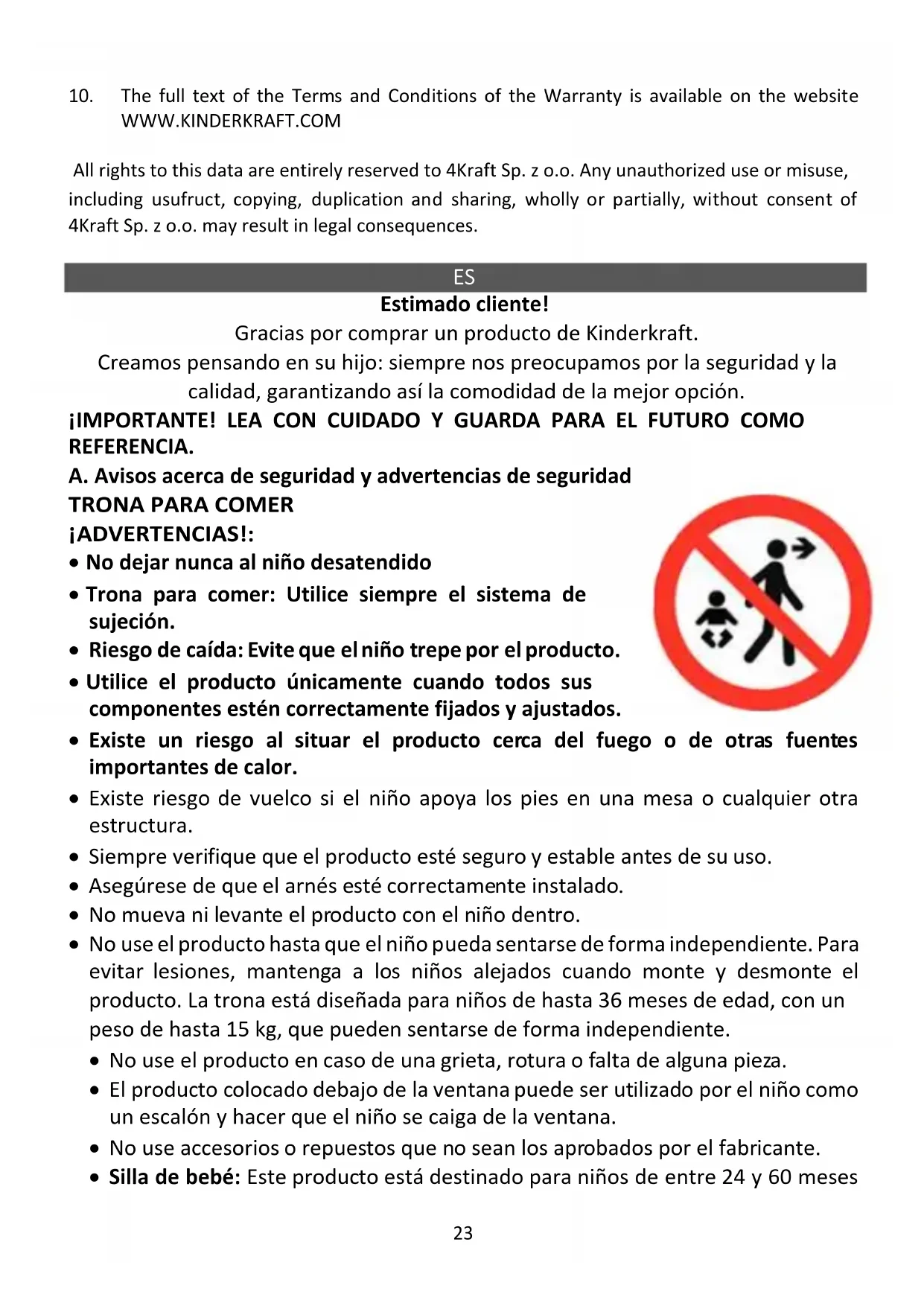 Estimado cliente! Gracias por comprar un producto de Kinderkraft. Creamos pensando en su hijo: siempre nos preocupamos por la seguridad y la calidad, garantizando así la comodidad de la mejor opción. ¡IMPORTANTE! LEA CON CUIDADO Y GUARDA PARA EL FUTURO COMO REFERENCIA. A. Avisos acerca de seguridad y advertencias de seguridad