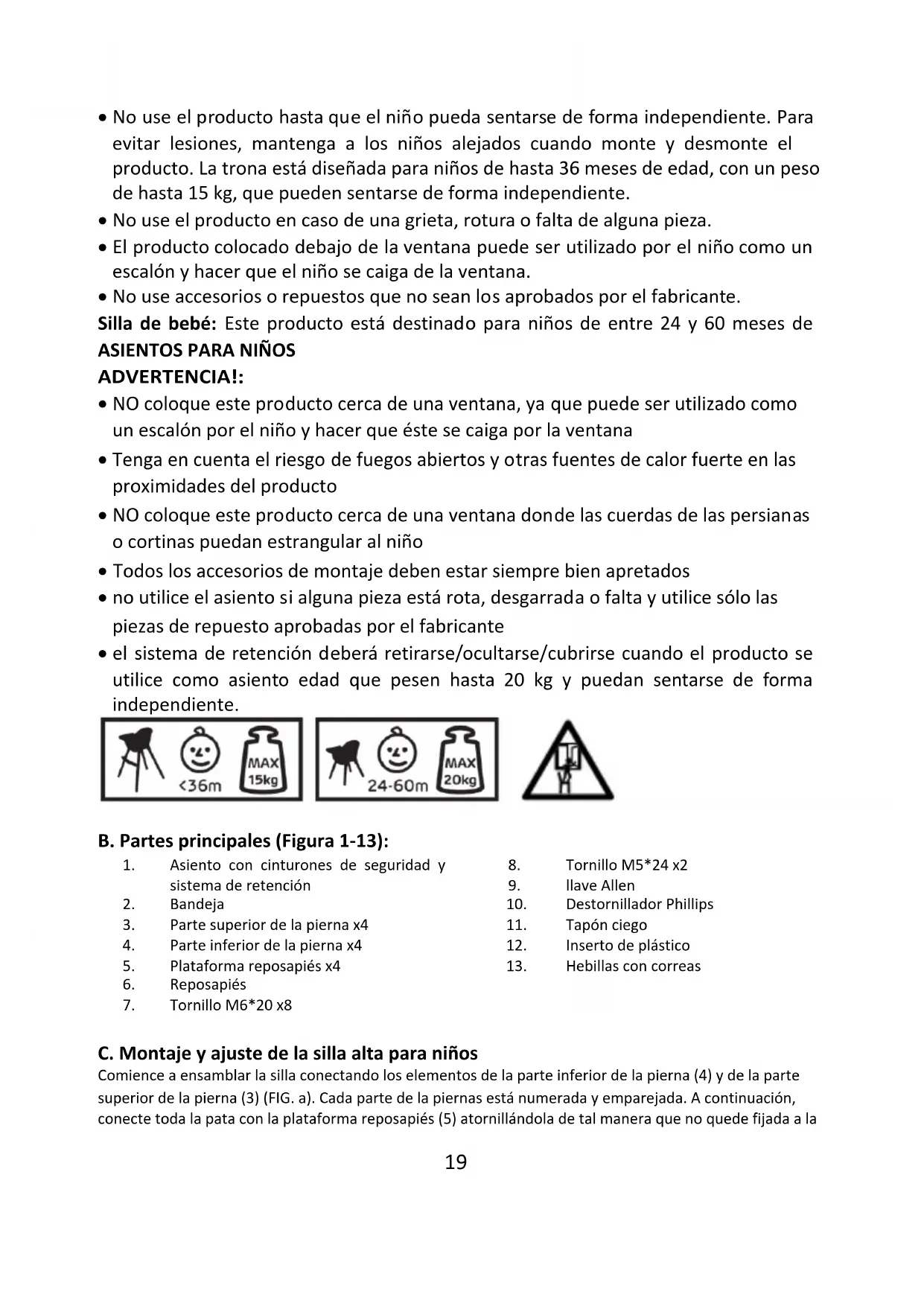 Tornillo M5*24 x2 llave Allen Destornillador Phillips Tapón ciego Inserto de plástico Hebillas con correas20 pierna (FIG. b). El siguiente paso es fijar las piernas al asiento (1). Para ello, introduzca las piernas en los orificios de la parte inferior del asiento de forma que los tornillos de las piernas encajen correctamente con los orificios de montaje (FIG. c). NOTA: Las piernas con orificios en el elemento 3 deben estar en la parte delantera de la silla. A continuación, utilice los tornillos (7) y una llave Allen (9) para fijar las piernas (FIG. d). Atornille el reposapiés (6) a la parte delantera de la silla con los tornillos (8). Fije la bandeja (2) a la silla con el mecanismo de encaje a presión. NOTA: Para retirar la bandeja, incline el pestillo de un lado y tire de la bandeja hacia arriba, luego repita el procedimiento en el otro lado. Para abrochar los cinturones de seguridad, conecte los cinturones de hombro y cadera y fíjelos en la hebilla de la correa. PRECAUCIÓN: El uso de los cinturones de seguridad es esencial para garantizar la seguridad del niño. El uso de la bandeja por sí sola no proporciona un apoyo adecuado para el niño. Use siempre el cinturón de seguridad. Los cinturones son ajustables. En la Fig. e. se muestra una silla correctamente montada. ¡Atención! La bandeja no es ajustable. D. Montaje de la silla para un niño mayor Después de desmontar la bandeja, desenrosque el dispositivo de fijación fijado al asiento (1) con un destornillador Phillips (10) y, a continuación, quite los cinturones. Para ello, pase los anillos de plástico a través de la abertura del asiento y de la funda de la silla. Instale la tapa (11) en lugar del elemento de seguridad (la encontrará dentro del elemento de seguridad al extraer el inserto de plástico (12)). Si necesita volver a instalar las correas para obtener la silla para comer, proceda en orden inverso. A continuación, retire el reposapiés y desenrosque las partes inferiores de las piernas y las plataformas de las piernas (ATENCIÓN: Atornille las plataformas a la parte superior de las piernas para asegurarlas). Al final de la instalación, asegure la cubierta con las hebillas con correas (13) pasándolas a través de los agujeros situados en la cubierta y en el asiento de la silla.En la Fig. f. se muestra una silla correctamente montada. E. Limpieza Silla: Limpie con un paño limpio y húmedo y jabón suave. Material y correas: Lave a mano. No utilice blanqueador. No seque en secadora. No planche. No limpie en seco. F. Garantía