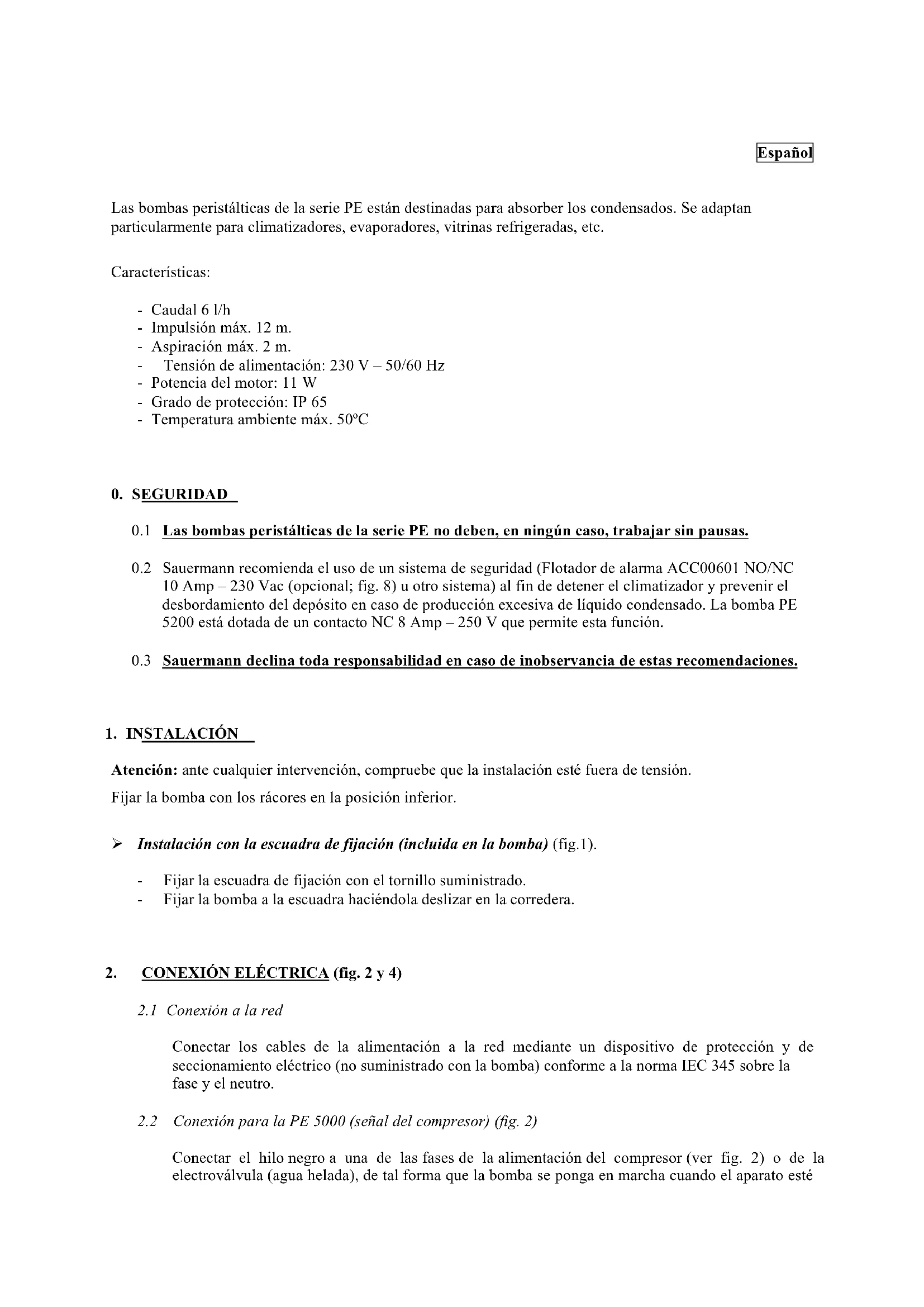 specifiche, di mancata manutenzione e in caso di mancato collegamento di un allarme (ACC00601, optional) per prevenire la tracimazione in caso di problemi nell’evacuazione del condensato.Español Las bombas peristálticas de la serie PE están destinadas para absorber los condensados. Se adaptan particularmente para climatizadores, evaporadores, vitrinas refrigeradas, etc. Características: - Caudal 6 l/h - Impulsión máx. 12 m. - Aspiración máx. 2 m. - Tensión de alimentación: 230 V – 50/60 Hz - Potencia del motor: 11 W - Grado de protección: IP 65 - Temperatura ambiente máx. 50ºC