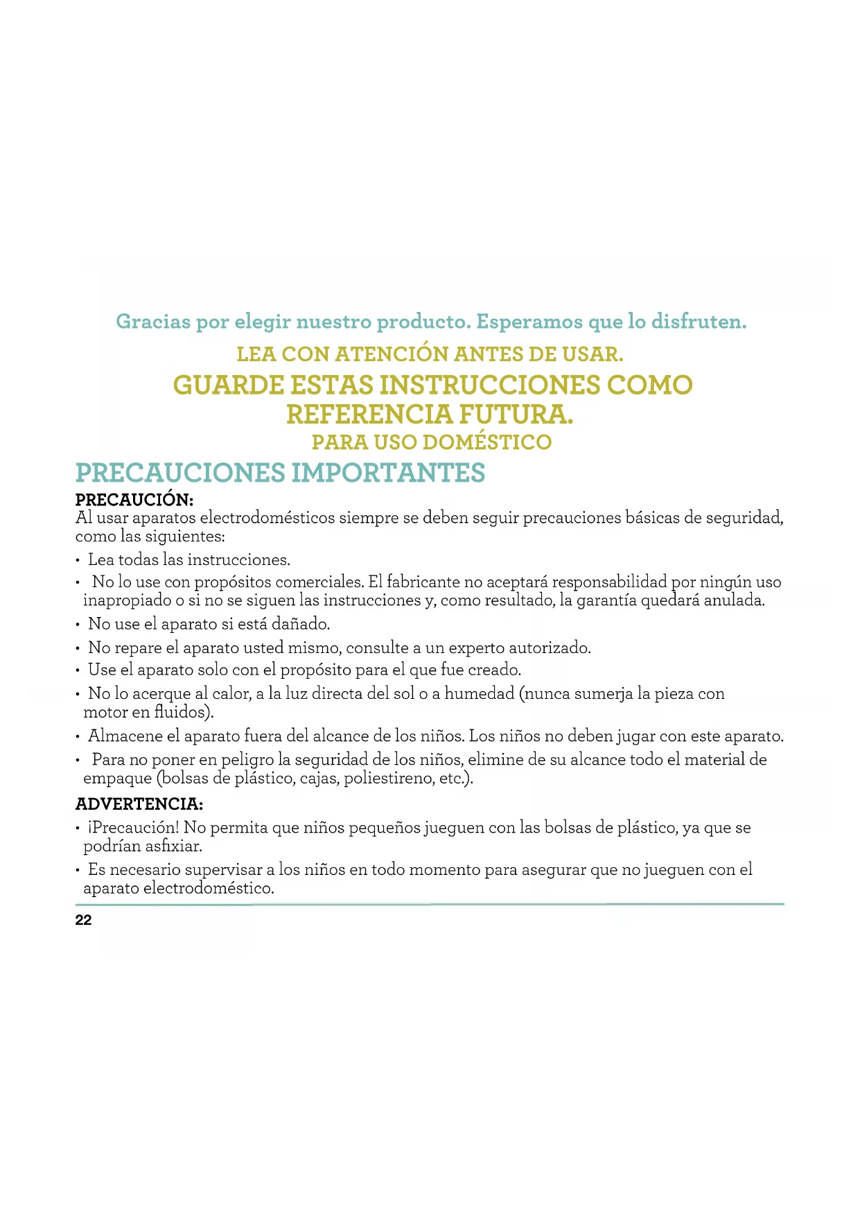 - Es necesario supervisar a los niños en todo momento para asegurar que no jueguen con el aparato electrodoméstico. Gracias por elegir nuestro producto. Esperamos que lo disfruten. LEA CON ATENCIÓN ANTES DE USAR.
