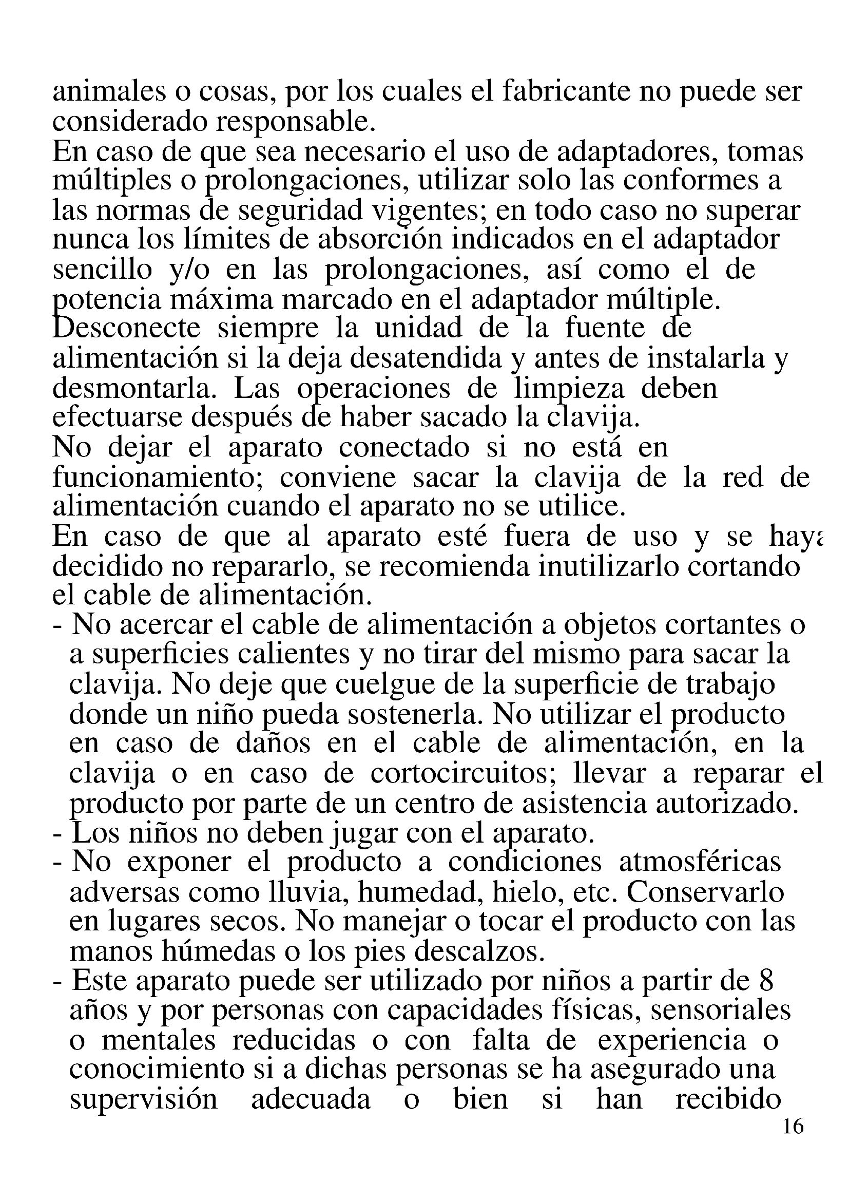 A continuación se presentan importantes indicaciones sobre la instalación, el uso y el mantenimiento. Conservar con cuidado este manual para cualquier consulta posterior; utilizar el producto solo de la manera que indica este manual de instrucciones; cualquier otro uso se considera inadecuado y peligroso; por ello el fabricante no puede ser considerado responsable en caso de que se produzcan daños derivados de usos inadecuados, erróneos o irracionales. Antes del uso asegurarse de la integridad del aparato; en caso de duda no utilizarlo y dirigirse al personal de asistencia; no dejar los elementos del embalaje (bolsas de plástico, poliestireno expandido, clavos, grapas, etc.) al alcance de los niños ya que son fuentes potenciales de peligro; además, cabe recordar que los citados elementos deben ser objeto de una recogida selectiva. Asegurarse de que los datos de la placa sean compatibles con los de la red eléctrica; la instalación se debe efectuar en función de las instrucciones del fabricante considerando la potencia del aparato indicada en la placa; una instalación errónea puede causar daños a personas,16 animales o cosas, por los cuales el fabricante no puede ser considerado responsable. En caso de que sea necesario el uso de adaptadores, tomas múltiples o prolongaciones, utilizar solo las conformes a las normas de seguridad vigentes; en todo caso no superar nunca los límites de absorción indicados en el adaptador sencillo y/o en las prolongaciones, así como el de potencia máxima marcado en el adaptador múltiple. Desconecte siempre la unidad de la fuente de alimentación si la deja desatendida y antes de instalarla y desmontarla. Las operaciones de limpieza deben efectuarse después de haber sacado la clavija. No dejar el aparato conectado si no está en funcionamiento; conviene sacar la clavija de la red de alimentación cuando el aparato no se utilice. En caso de que al aparato esté fuera de uso y se haya decidido no repararlo, se recomienda inutilizarlo cortando el cable de alimentación. - No acercar el cable de alimentación a objetos cortantes o a superficies calientes y no tirar del mismo para sacar la clavija. No deje que cuelgue de la superficie de trabajo donde un niño pueda sostenerla. No utilizar el producto en caso de daños en el cable de alimentación, en la clavija o en caso de cortocircuitos; llevar a reparar el producto por parte de un centro de asistencia autorizado. - Los niños no deben jugar con el aparato. - No exponer el producto a condiciones atmosféricas adversas como lluvia, humedad, hielo, etc. Conservarlo en lugares secos. No manejar o tocar el producto con las manos húmedas o los pies descalzos. - Este aparato puede ser utilizado por niños a partir de 8 años y por personas con capacidades físicas, sensoriales o mentales reducidas o con falta de experiencia o conocimiento si a dichas personas se ha asegurado una supervisión adecuada o bien si han recibido17 instrucciones sobre el uso seguro del aparato; las operaciones de limpieza y de mantenimiento no deben ser efectuadas por niños a no ser que tengan más de 8 años y estén supervisados. - Mantener el producto y el cable fuera del alcance de los niños menores de 8 años. - No apto para uso comercial. Solo para uso doméstico En caso de avería y/o de funcionamiento anómalo no manipular el aparato. Para una posible reparación, dirigirse únicamente a un centro autorizado por el fabricante y solicitar el uso de recambios originales. El incumplimiento de lo indicado anteriormente puede comprometer la seguridad del aparato y anular las condiciones de la garantía. ATENCIÓN: el producto tiene una función de calentamiento. Las superficies pueden desarrollar altas temperaturas. La percepción de la temperatura es distinta para cada persona, utilizar el aparato con cautela. Tocar solo las superficies diseñadas para ser tocadas, y usar agarradores o guantes de cocina. El aparato no está diseñado para su uso a través de temporizadores externos o mandos a distancia. Antes de cada uso, desenrolle el cable de alimentación. Utilice únicamente piezas de repuesto y accesorios originales. No someta el producto a impactos fuertes se producirán daños serios. Este aparato está diseñado para uso doméstico o similares: cocinas para el personal de tiendas, oficinas u otros centros de trabajo, para clientes de hoteles, moteles, hostales y similares. Mantenga la unidad lejos de materiales inflamables, calor, puntos fríos y vapor.