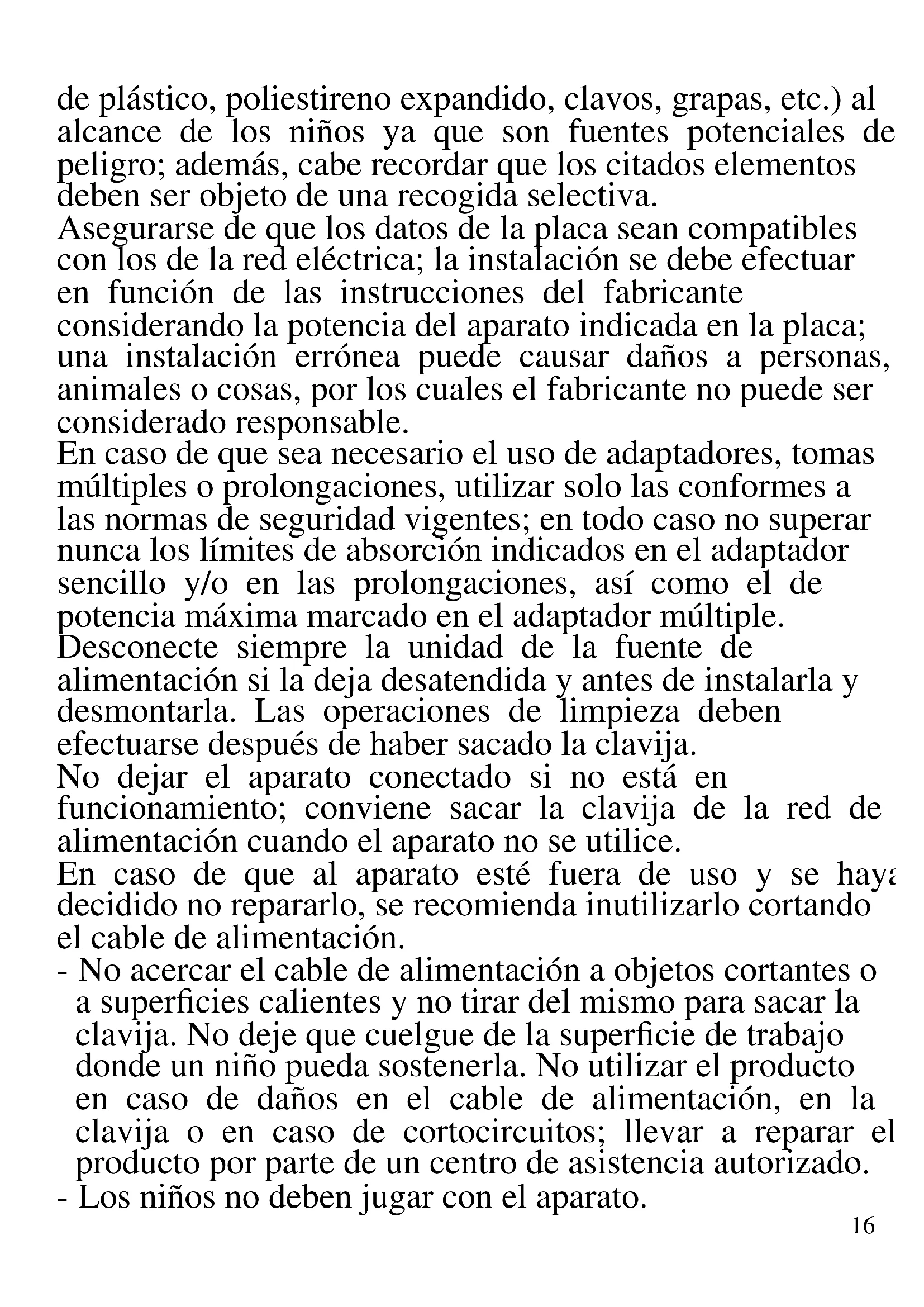 A continuación se presentan importantes indicaciones sobre la instalación, el uso y el mantenimiento. Conservar con cuidado este manual para cualquier consulta posterior; utilizar el producto solo de la manera que indica este manual de instrucciones; cualquier otro uso se considera inadecuado y peligroso; por ello el fabricante no puede ser considerado responsable en caso de que se produzcan daños derivados de usos inadecuados, erróneos o irracionales. Antes del uso asegurarse de la integridad del aparato; en caso de duda no utilizarlo y dirigirse al personal de asistencia; no dejar los elementos del embalaje (bolsas16 de plástico, poliestireno expandido, clavos, grapas, etc.) al alcance de los niños ya que son fuentes potenciales de peligro; además, cabe recordar que los citados elementos deben ser objeto de una recogida selectiva. Asegurarse de que los datos de la placa sean compatibles con los de la red eléctrica; la instalación se debe efectuar en función de las instrucciones del fabricante considerando la potencia del aparato indicada en la placa; una instalación errónea puede causar daños a personas, animales o cosas, por los cuales el fabricante no puede ser considerado responsable. En caso de que sea necesario el uso de adaptadores, tomas múltiples o prolongaciones, utilizar solo las conformes a las normas de seguridad vigentes; en todo caso no superar nunca los límites de absorción indicados en el adaptador sencillo y/o en las prolongaciones, así como el de potencia máxima marcado en el adaptador múltiple. Desconecte siempre la unidad de la fuente de alimentación si la deja desatendida y antes de instalarla y desmontarla. Las operaciones de limpieza deben efectuarse después de haber sacado la clavija. No dejar el aparato conectado si no está en funcionamiento; conviene sacar la clavija de la red de alimentación cuando el aparato no se utilice. En caso de que al aparato esté fuera de uso y se haya decidido no repararlo, se recomienda inutilizarlo cortando el cable de alimentación. - No acercar el cable de alimentación a objetos cortantes o a superficies calientes y no tirar del mismo para sacar la clavija. No deje que cuelgue de la superficie de trabajo donde un niño pueda sostenerla. No utilizar el producto en caso de daños en el cable de alimentación, en la clavija o en caso de cortocircuitos; llevar a reparar el producto por parte de un centro de asistencia autorizado. - Los niños no deben jugar con el aparato.17 - No exponer el producto a condiciones atmosféricas adversas como lluvia, humedad, hielo, etc. Conservarlo en lugares secos. No manejar o tocar el producto con las manos húmedas o los pies descalzos. - Este aparato puede ser utilizado por niños a partir de 8 años y por personas con capacidades físicas, sensoriales o mentales reducidas o con falta de experiencia o conocimiento si a dichas personas se ha asegurado una supervisión adecuada o bien si han recibido instrucciones sobre el uso seguro del aparato; las operaciones de limpieza y de mantenimiento no deben ser efectuadas por niños a no ser que tengan más de 8 años y estén supervisados. - Mantener el producto y el cable fuera del alcance de los niños menores de 8 años. - No apto para uso comercial. Solo para uso doméstico En caso de avería y/o de funcionamiento anómalo no manipular el aparato. Para una posible reparación, dirigirse únicamente a un centro autorizado por el fabricante y solicitar el uso de recambios originales. El incumplimiento de lo indicado anteriormente puede comprometer la seguridad del aparato y anular las condiciones de la garantía. ATENCIÓN: el producto tiene una función de calentamiento. Las superficies pueden desarrollar altas temperaturas. La percepción de la temperatura es distinta para cada persona, utilizar el aparato con cautela. Tocar solo las superficies diseñadas para ser tocadas, y usar agarradores o guantes de cocina. El aparato no está diseñado para su uso a través de temporizadores externos o mandos a distancia. Antes de cada uso, desenrolle el cable de alimentación. Utilice únicamente piezas de repuesto y accesorios originales. No someta el producto a impactos fuertes se producirán daños serios.18 Este aparato está diseñado para uso doméstico o similares: cocinas para el personal de tiendas, oficinas u otros centros de trabajo, para clientes de hoteles, moteles, hostales y similares. Mantenga la unidad lejos de materiales inflamables, calor, puntos fríos y vapor.