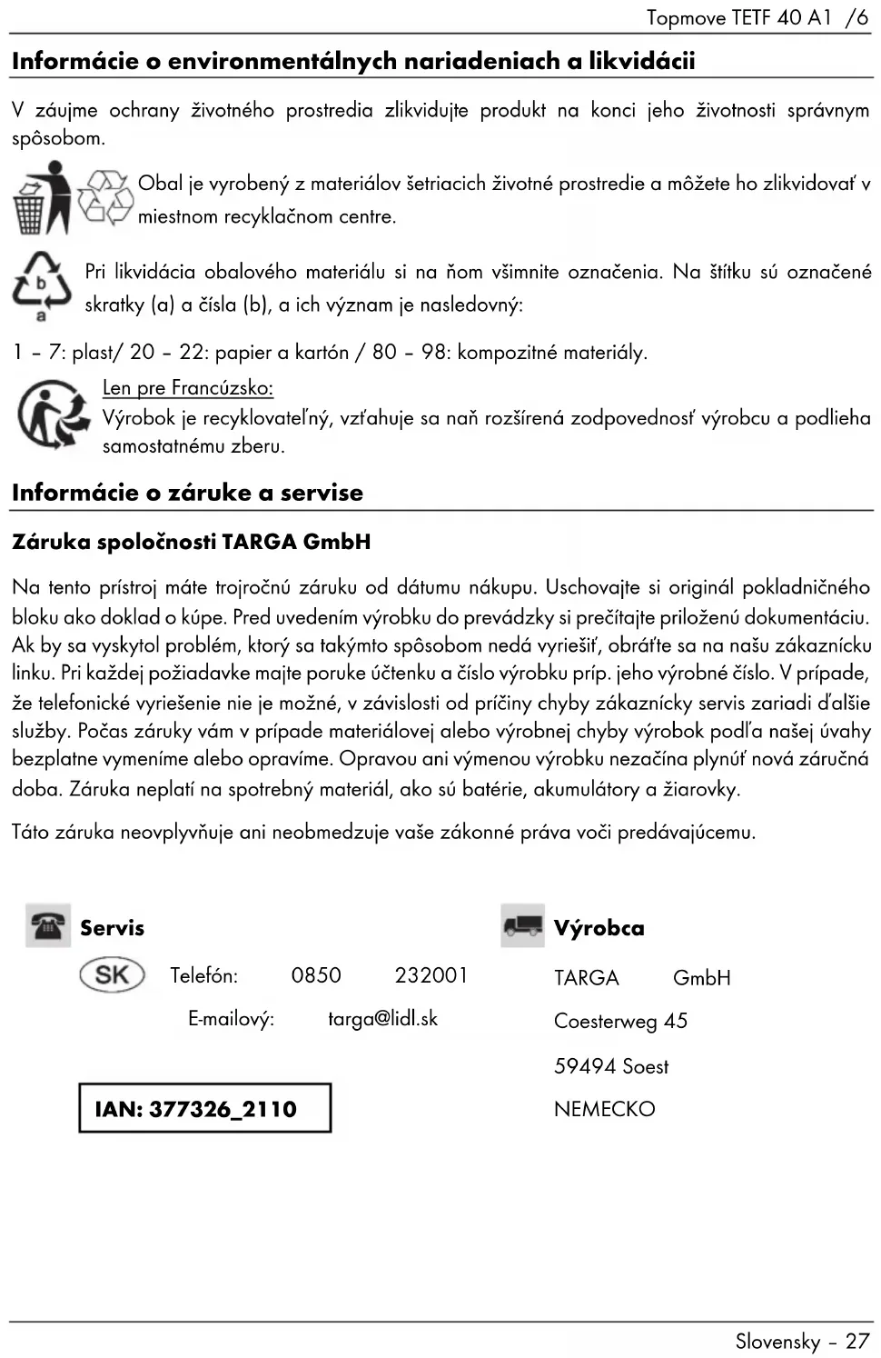 Normativa medioambiental e información sobre el desecho Cuando el producto llegue al final de su vida útil y con el fin de proteger el medioambiente, recíclelo debidamente. El embalaje está hecho de materiales compatibles con el medio ambiente y se puede depositar en su centro de reciclaje local. Tenga en cuenta el etiquetado del material de embalaje a la hora de desecharlo. Las abreviaturas (a) y los números (b) significan lo siguiente: 1–7: plástico / 20–22: papel y cartón / 80-98: materiales compuestos. Información relevante solo para Francia: El producto es reciclable, está sujeto a una responsabilidad ampliada del fabricante y se recoge por separado. Información sobre la garantía y el servicio posventa Garantía de TARGA GmbH Este aparato tiene 3 años de garantía a partir de la fecha de compra. Guarde el comprobante de caja original para poder acreditar la compra. Antes de poner en marcha el producto, lea la documentación adjunta. Si experimenta algún problema y no puede solucionarlo con ayuda de esas instrucciones, llame a nuestro servicio de atención al cliente. Siempre que vaya a realizar una consulta, tenga preparada la referencia o el número de serie del aparato. Si no fuera posible solucionar el problema por teléfono, y dependiendo de la causa del mismo, nuestro servicio de atención al cliente le pasará con otro servicio técnico. Al utilizar la garantía por defectos de material o de fabricación en el producto, nosotros nos haremos cargo de la reparación o sustitución gratuitas del producto, de acuerdo con nuestro propio criterio. La reparación o sustitución del producto no dan lugar a ningún plazo de garantía nuevo. La garantía no cubre los materiales consumibles, tales como pilas, baterías y bombillas. Sus derechos como consumidor ante el comerciante no se ven alterados en ningún momento por esta garantía.