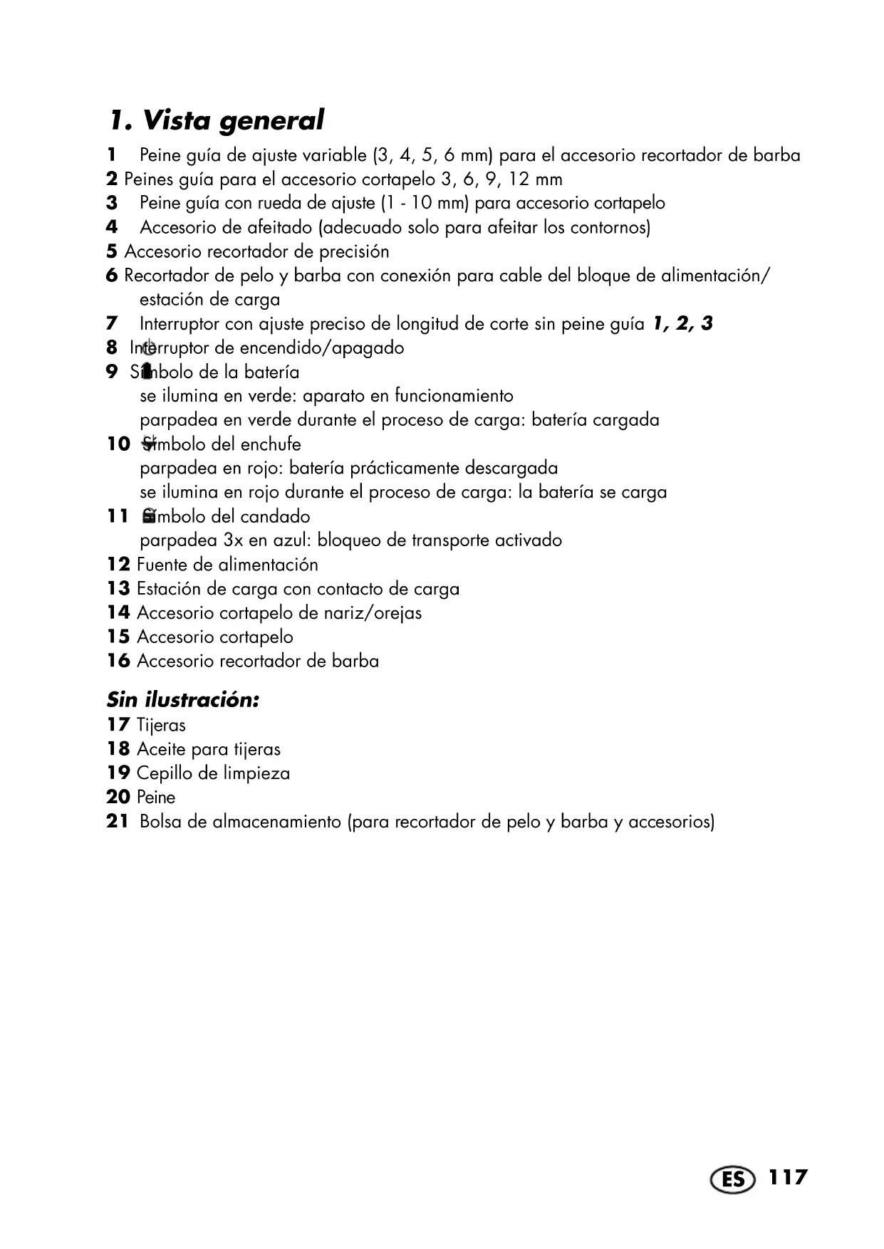 Peine guía con rueda de ajuste (1 - 10 mm) para accesorio cortapelo 4 Accesorio de afeitado (adecuado solo para afeitar los contornos) 5 Accesorio recortador de precisión 6 Recortador de pelo y barba con conexión para cable del bloque de alimentación/ estación de carga 7 Interruptor con ajuste preciso de longitud de corte sin peine guía 1, 2, 3 8 Interruptor de encendido/apagado 9 Símbolo de la batería se ilumina en verde: aparato en funcionamiento parpadea en verde durante el proceso de carga: batería cargada 10 Símbolo del enchufe parpadea en rojo: batería prácticamente descargada se ilumina en rojo durante el proceso de carga: la batería se carga 11 Símbolo del candado parpadea 3x en azul: bloqueo de transporte activado 12 Fuente de alimentación 13 Estación de carga con contacto de carga 14 Accesorio cortapelo de nariz/orejas 15 Accesorio cortapelo 16 Accesorio recortador de barba Sin ilustración: 17 Tijeras 18 Aceite para tijeras 19 Cepillo de limpieza 20 Peine 21 Bolsa de almacenamiento (para recortador de pelo y barba y accesorios) __384419_2107_B8.book Seite 117 Mittwoch, 17. November 2021 11:35 11118