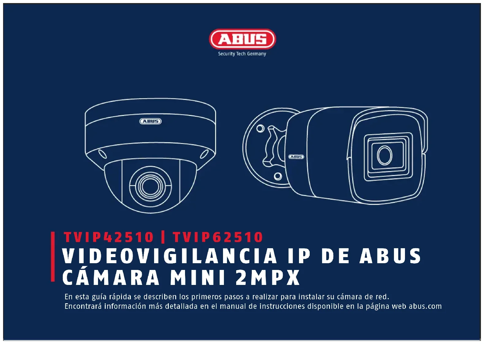 En esta guía rápida se describen los primeros pasos a realizar para instalar su cámara de red. Encontrará información más detallada en el manual de instrucciones disponible en la página web abus.com76 Español Cámara mini Domo 2MPx (TVIP42510) Cámara mini Tubo 2MPx (TVIP62510)