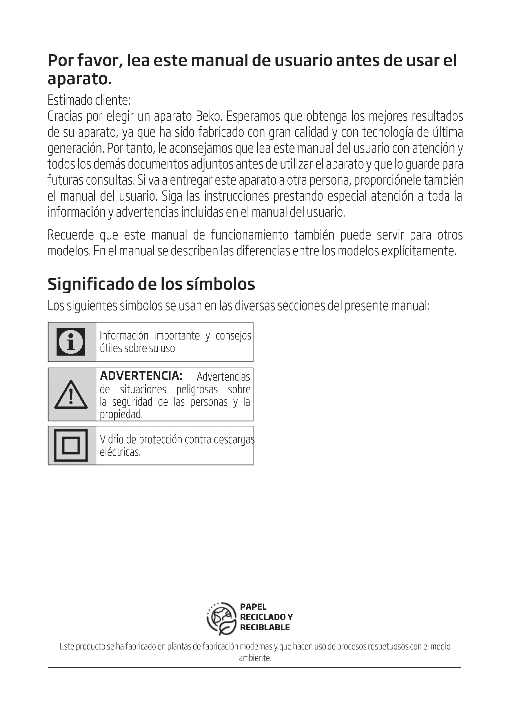 El coste de la reparación será a cargo del usuario en los siguientes casos: Los aparatos utilizados para uso profesional o no exclusivamente doméstico, en establecimientos públicos, industriales o comerciales. Los aparatos desmontados o manipulados por personas ajenas a los servicios técnicos expresamente autorizados. Las instalaciones, transporte, sustitución de aparatos, puestas en marcha, cambio de sentido de puertas. Intervenciones de mantenimiento o de información sobre el uso de los aparatos. Cambio de inyectores en aparatos de gas. Las averías provocadas por falta de mantenimiento o limpieza o aquellas provocadas por un uso indebido, sobrecarga, abandono o de manera no conforme a las instrucciones de uso o de instalación de los aparatos. Las averías producidas por causas fortuitas, siniestros de fuerza mayor o derivados de instalación incorrecta y en general, averías por causas ajenas al propio aparato. Las averías provocadas por conexiones que puedan presentar fluctuaciones, irregularidades o falta de uniformidad en el suministro, por ejemplo: suministro de agua impulsado por grupos de presión, energía solar, energía eólica, generadores eléctricos, u otro tipo de suministro no normalizado. La sustitución de materiales rotos o deteriorados por desgaste o uso no normal del aparato, o materiales consumibles tales como: juntas, plásticos, gomas, correas, cristales, escobillas, bombillas, asas, tiradores, tapas de quemadores, filtros, rejillas, ánodos de sacrificio (magnesio o similares) de calentadores o calderas, etc. Los aparatos que presenten oxidación, o daños por corrosión en esmaltes o pinturas, que puedan ser provocados por efectos químicos o electroquímicos del agua o cualquier otra sustancia, o aceleradas por circunstancias ambientales o climáticas no propicias. Defectos estéticos en serigrafía o pintura. Los daños de transporte o manipulación, golpes, etc. Los aparatos deben instalarse de forma accesible para su reparación, debiendo asumir el usuario los costes necesarios para el acceso al aparato para su reparación y sustitución. La presente garantía no afecta a los derechos de que dispone el consumidor conforme a lo previsto en la legislación vigente. El Servicio Oficial de Asistencia Técnica resolverá cualquier incidencia que pudiera precisar su electrodoméstico siempre que el aparato esté instalado de forma accesible. Para asegurarse que su electrodoméstico va a ser intervenido por un técnico oficial autorizado, rogamos solicite el carnet avalado por ANFEL (Asociación Nacional de Fabricantes de Electrodomésticos) a nuestros técnicos. Las marcas BEKO, ALTUS, BLOMBERG, y GRUNDIG se distribuyen por Beko Electronics España S.L. DATOS APARATO (a rellenar por el Distribuidor): Titular: Sello Establecimiento: Modelo: Núm. serie: Establecimiento: Fecha de compra: El garante e importador de su electrodoméstico es: BEKO ELECTRONICS ESPAÑA S.L. Calle Provenza nº 388 3º Barcelona 08025, España. El producto ha sido fabricado por ARÇELIK A.S (Arçelik A.S.Sütluce Karaagaç Cad. No:2-6 34445 Beyoglu, Istanbul, Turkey) o Arctic S.A. (210, 13 Decembrie St., 135200, Gaesti, Dambovita, Romania Conózcanos mejor en nuestra página: www.beko.com Conserve este documento, es importante para usted. (*) Se consideran electrodomésticos de gama blanca, los aparatos de frío, cocción, lavado y secado, etc, no incluidos en la categoría de pequeño aparato electrodoméstico (PAE).V2_2022 2021_12