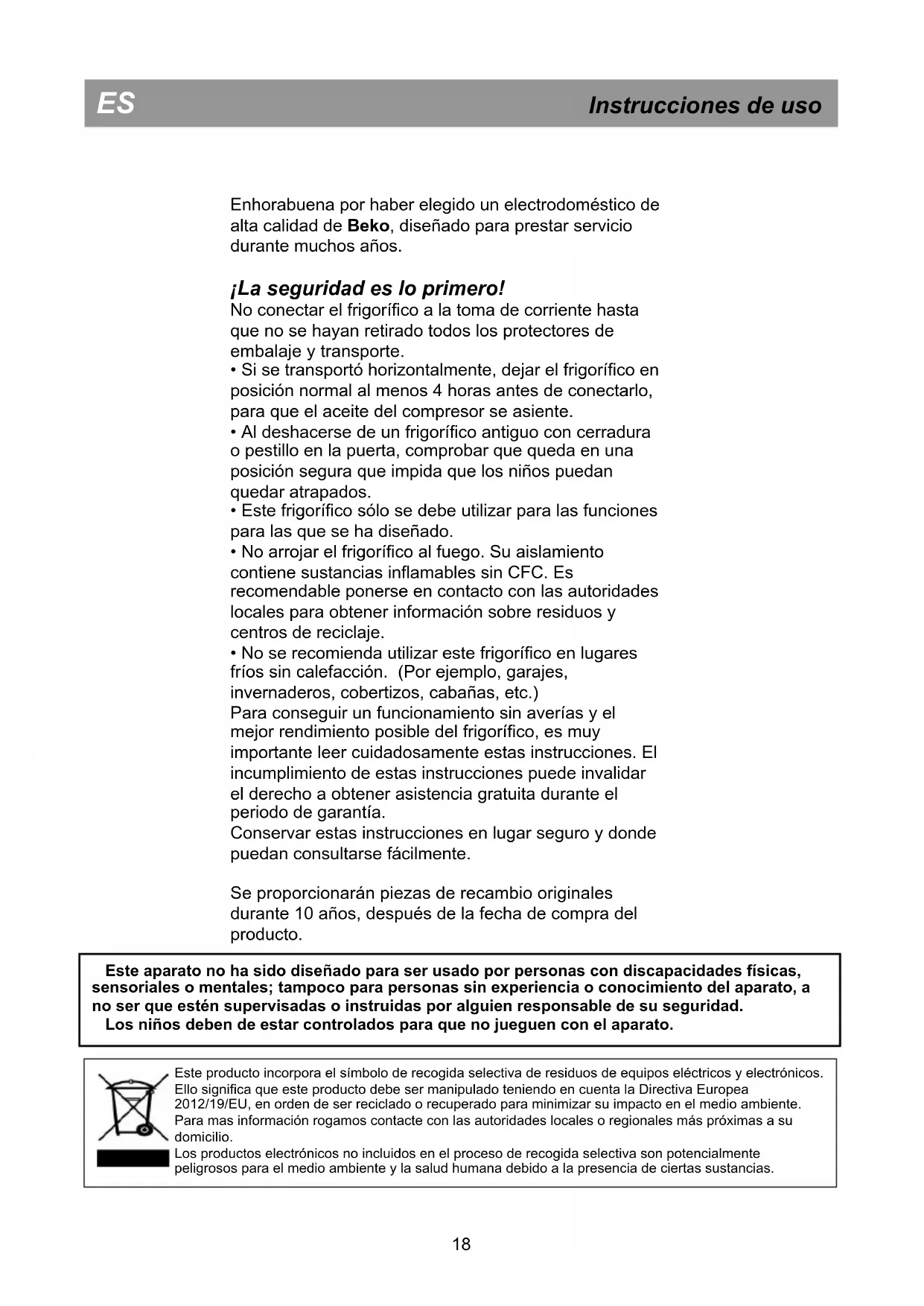 Este aparato no ha sido diseñado para ser usado por personas con discapacidades físicas, sensoriales o mentales; tampoco para personas sin experiencia o conocimiento del aparato, a no ser que estén supervisadas o instruidas por alguien responsable de su seguridad. Los niños deben de estar controlados para que no jueguen con el aparato. ES Instrucciones de uso Este producto incorpora el símbolo de recogida selectiva de residuos de equipos eléctricos y electrónicos. Ello significa que este producto debe ser manipulado teniendo en cuenta la Directiva Europea 2012/19/EU, en orden de ser reciclado o recuperado para minimizar su impacto en el medio ambiente. Para mas información rogamos contacte con las autoridades locales o regionales más próximas a su domicilio. Los productos electrónicos no incluidos en el proceso de recogida selectiva son potencialmente peligrosos para el medio ambiente y la salud humana debido a la presencia de ciertas sustancias.ES Instrucciones de uso Requisitos eléctricos Antes de conectar el enchufe a la toma de corriente, se debe comprobar que el voltaje y la frecuencia mostradas en la placa de características del interior del frigorífico se corresponden con los de la alimentación eléctrica. Se recomienda conectar este frigorífico a la red de suministro eléctrico mediante una toma de corriente adecuada, con fusible e interruptor y en una posición de fácil acceso. Advertencia. Este frigorífico debe disponer de toma de tierra. Las reparaciones del equipo eléctrico sólo deben ser realizadas por técnicos cualificados. Las reparaciones incorrectas realizadas por personal no cualificado comportan riesgos que pueden acarrear graves consecuencias al usuario del frigorífico. !ATENCIÓN! Este electrodoméstico funciona con R600a, un gas respetuoso con el medio ambiente pero inflamable. Durante el transporte y la fijación del electrodoméstico, es necesario tener cuidado para no dañar el sistema de refrigeración. Si el sistema de refrigeración sufre algún daño y se produce una fuga de gases del sistema, mantenga el producto alejado de fuentes de ignición y ventile el recinto durante el tiempo adecuado. ADVERTENCIA: Utilizar sólo los dispositivos mecánicos o los medios recomendados por el fabricante para acelerar el proceso de desescarchado. ADVERTENCIA: Evitar daños en el circuito de refrigeración. ADVERTENCIA: No utilizar aparatos eléctricos dentro de los compartimentos para alimentos del frigorífico, a menos que sean del tipo recomendado por el fabricante. ADVERTENCIA: Si el cable de alimentación estuviera dañado, el fabricante, el servicio de atención al cliente o una persona cualificada deberán sustituirlo para evitar peligros. Instrucciones de transporte