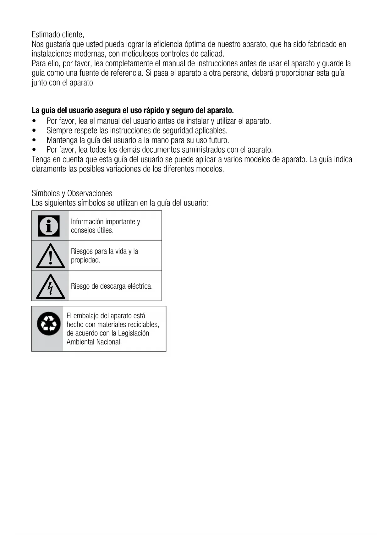 RECOMENDAÇÕES: Se os problemas persistirem depois de seguir as instruções nesta secção, contactar o seu vendedor ou uma Assistência Autorizada. Não tentar reparar o produto.Estimado cliente, Nos gustaría que usted pueda lograr la eficiencia óptima de nuestro aparato, que ha sido fabricado en instalaciones modernas, con meticulosos controles de calidad. Para ello, por favor, lea completamente el manual de instrucciones antes de usar el aparato y guarde la guía como una fuente de referencia. Si pasa el aparato a otra persona, deberá proporcionar esta guía junto con el aparato. La guía del usuario asegura el uso rápido y seguro del aparato. t Por favor, lea el manual del usuario antes de instalar y utilizar el aparato. t Siempre respete las instrucciones de seguridad aplicables. t Mantenga la guía del usuario a la mano para su uso futuro. t Por favor, lea todos los demás documentos suministrados con el aparato. Tenga en cuenta que esta guía del usuario se puede aplicar a varios modelos de aparato. La guía indica claramente las posibles variaciones de los diferentes modelos. Símbolos y Observaciones Los siguientes símbolos se utilizan en la guía del usuario: