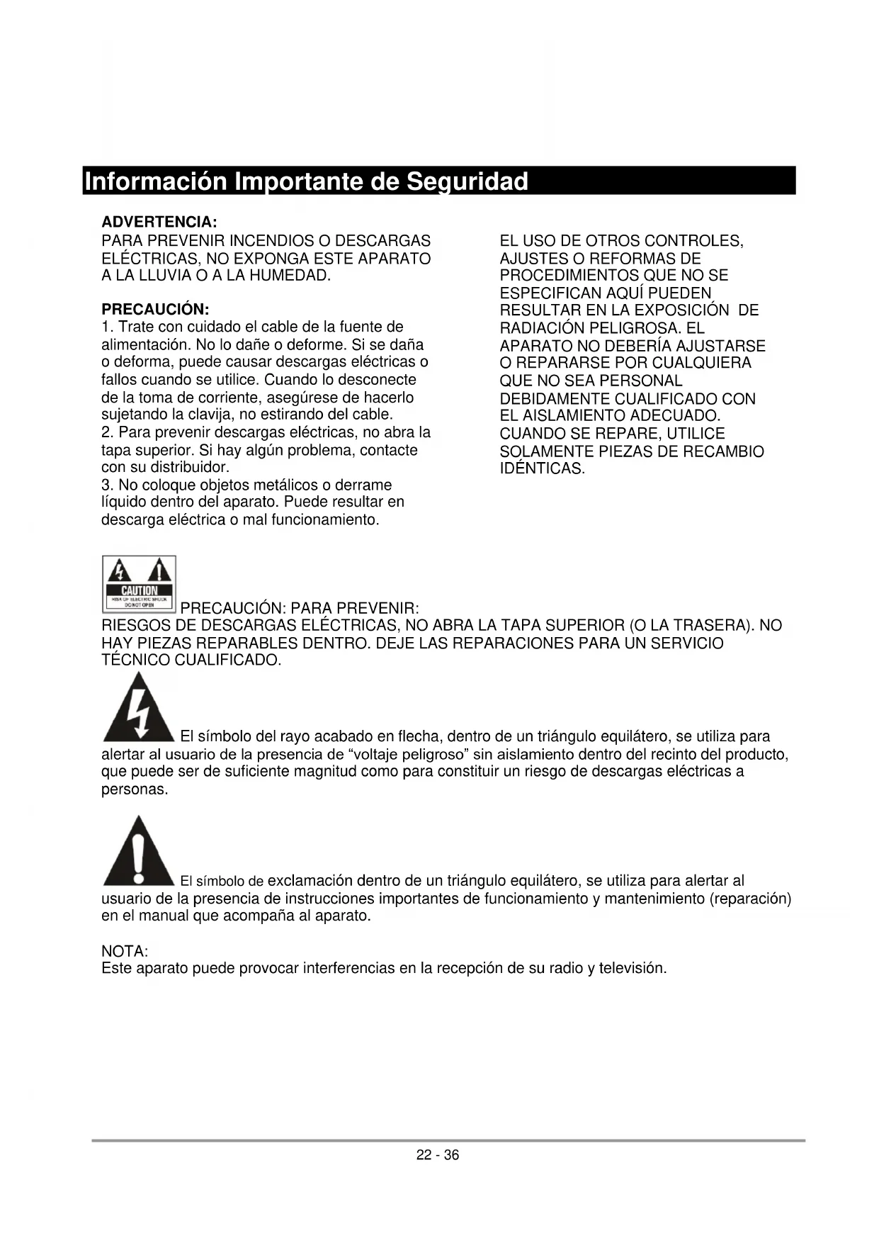 IDÉNTICAS. PRECAUCIÓN: PARA PREVENIR: RIESGOS DE DESCARGAS ELÉCTRICAS, NO ABRA LA TAPA SUPERIOR (O LA TRASERA). NO HAY PIEZAS REPARABLES DENTRO. DEJE LAS REPARACIONES PARA UN SERVICIO TÉCNICO CUALIFICADO. El símbolo del rayo acabado en flecha, dentro de un triángulo equilátero, se utiliza para alertar al usuario de la presencia de “voltaje peligroso” sin aislamiento dentro del recinto del producto, que puede ser de suficiente magnitud como para constituir un riesgo de descargas eléctricas a personas. El símbolo de exclamación dentro de un triángulo equilátero, se utiliza para alertar al usuario de la presencia de instrucciones importantes de funcionamiento y mantenimiento (reparación) en el manual que acompaña al aparato. NOTA: Este aparato puede provocar interferencias en la recepción de su radio y televisión.23 - 36
