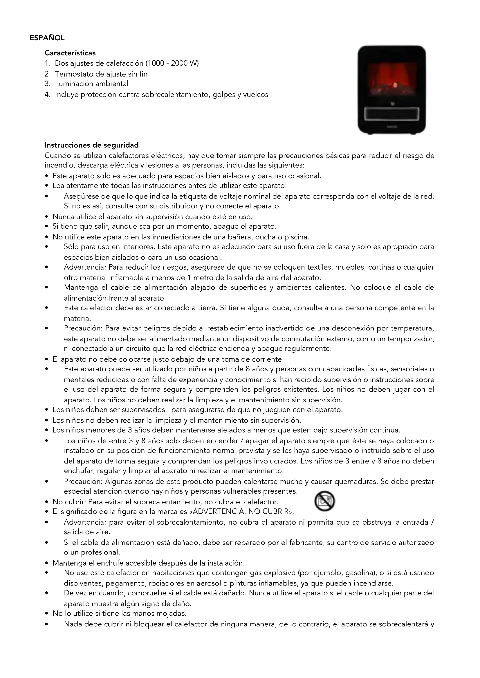 ESPAÑOLDispositivo seguro contra el sobrecalentamiento Su aparato está equipado con un dispositivo de seguridad que apaga el calefactor en caso de sobrecalentamiento. Si el calefactor deja de funcionar, apáguelo y compruebe si la entrada o salida está bloqueada. Desconecte el enchufe y espere al menos 10 minutos para que el sistema de protección se reinicie antes de intentar reiniciar el calefactor. Si el interruptor de seguridad aún apaga el calefactor e impide que funcione, llévelo al centro de servicio más cercano para que lo examinen o lo reparen. Atención: antes de reiniciar el calefactor, debe desconectar el enchufe durante al menos 10 minutos. La figura de la marca significa: «ADVERTENCIA: NO CUBRIR». Advertencia: Este calefactor no está equipado con un dispositivo para comprobar la temperatura ambiente. No use este calefactor en habitaciones pequeñas si están ocupadas por personas que no pueden salir de la habitación por sí mismas, a menos que se proporcione una supervisión constante. Limpieza