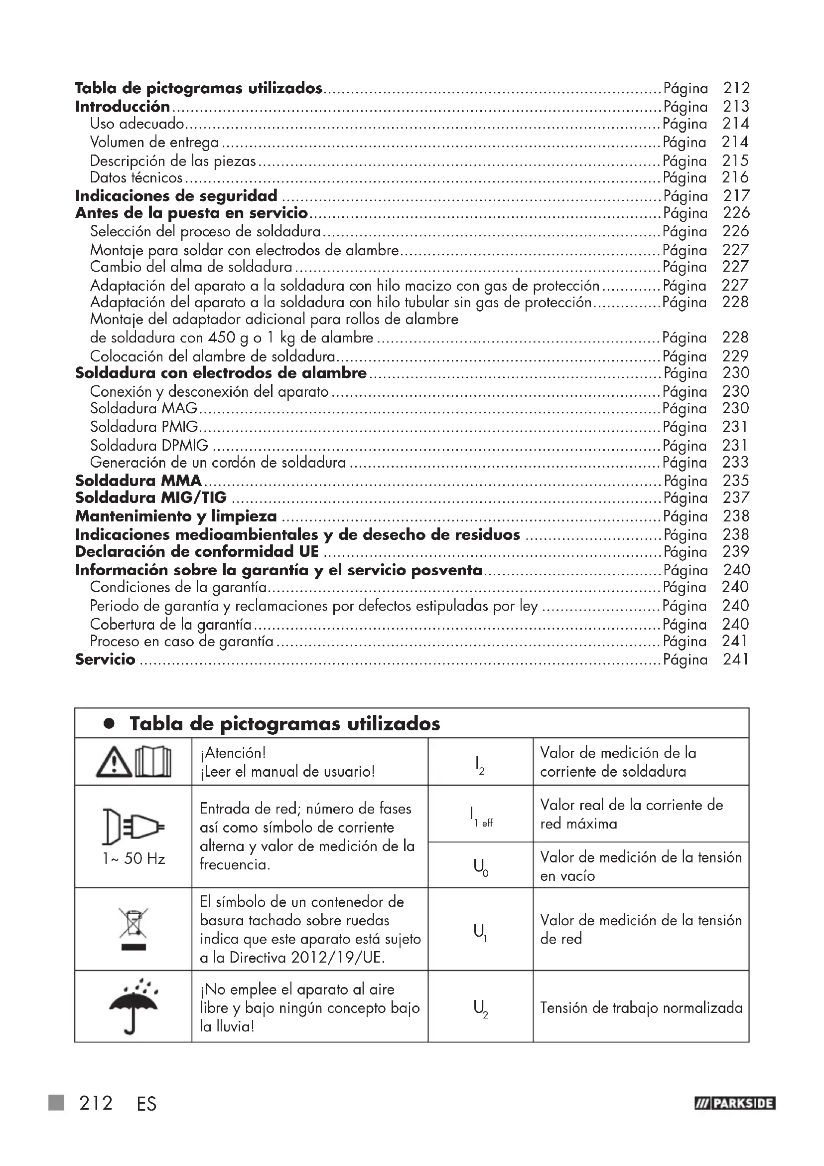 Valor de medición máximo del tiempo de soldadura en modo continuo t ON (máx.) Soldadura manual con arco eléctrico con electrodos de varilla con revestimiento Soldadura con gas activo e inerte-metal incluido el uso de hilo tubular Soldadura de gas inerte-wolframio Usted está obligado por ley a separar los aparatos así señalizados de los residuos urbanos sin clasificar. La eliminación con la basura doméstica está prohibida. Soldador multifunción con technología de doble pulsado PMPS 200 B1 z Introducción ¡Enhorabuena! Usted ha elegido un aparato de calidad de nuestra empresa. Familiarícese con el producto antes de la primera puesta en funcionamiento. Para ello, lea detenidamente el siguiente manual de instrucciones y las indicaciones de seguridad. La puesta en marcha de esta herramienta debe ser realizada por personal capacitado.214