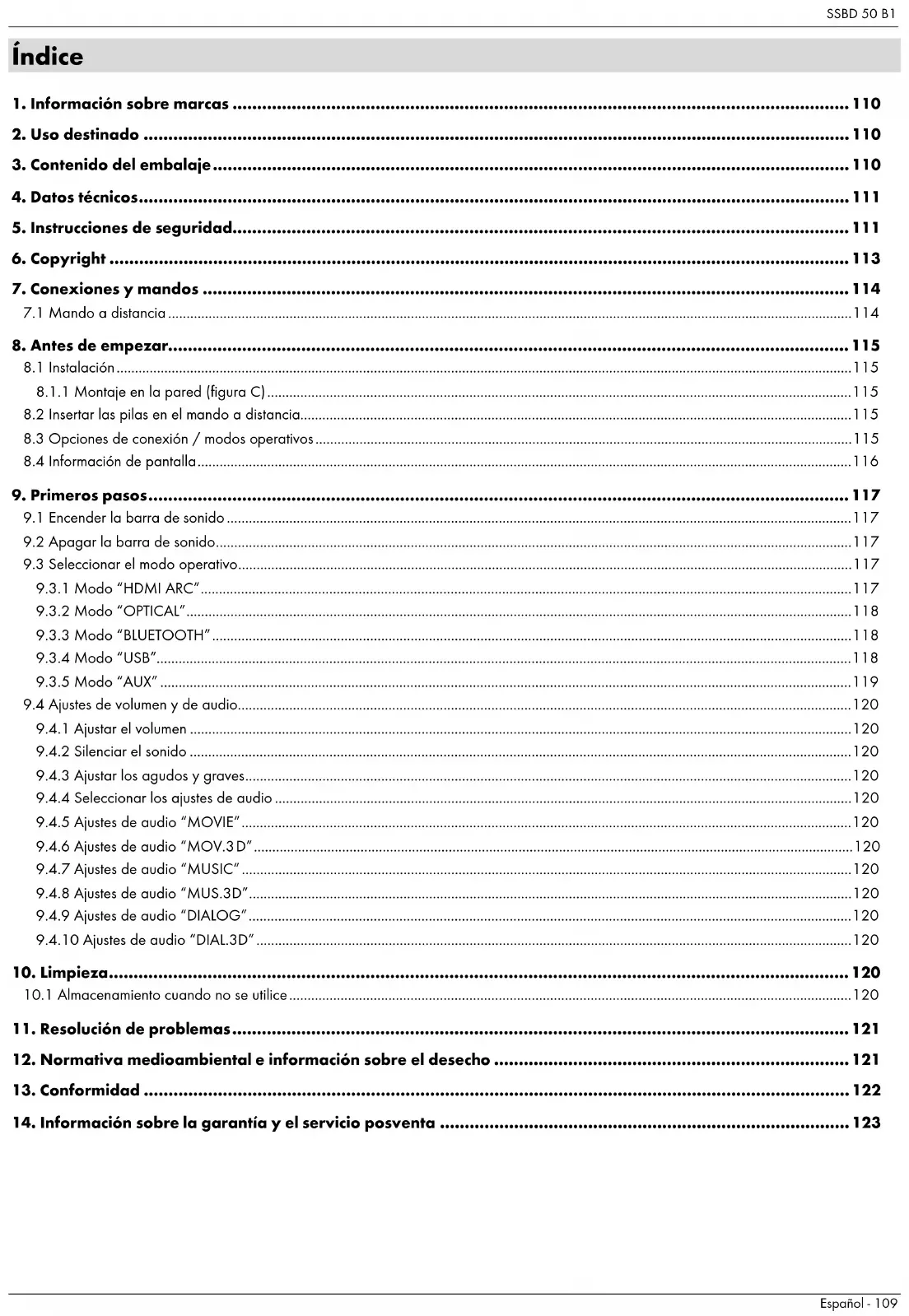 TARGA GmbH declara que el producto inalámbrico, modelo SSBD 50 B1 cumple los requisitos de la Directiva 2014/53/EU, de la Directiva ERP 2009/125/EC y de la Directiva RoHS 2011/65/EU. Puede descargarse la Declaración CE de conformidad completa en: https://www.targa.gmbh/downloads/conformity/411069_2201.pdfSSBD 50 B1 Español - 123