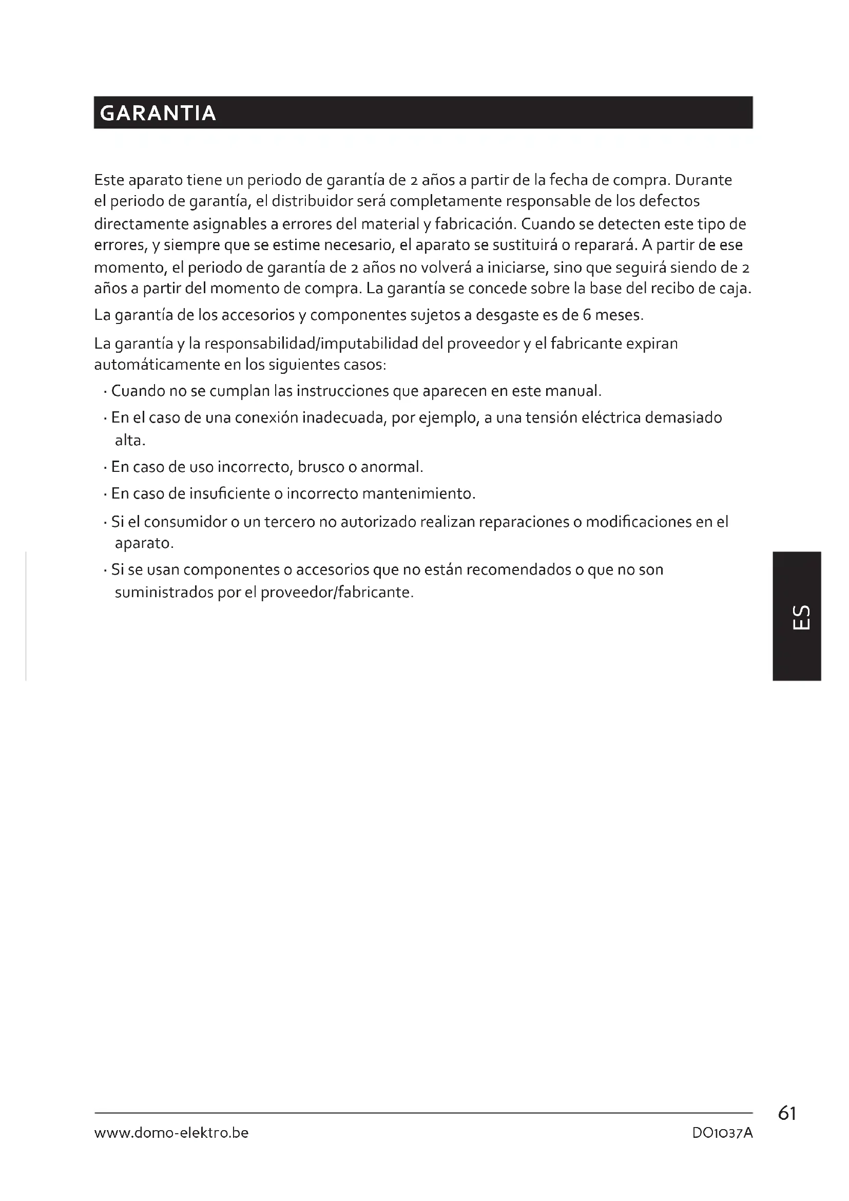 - No coloque el aparato encima o cerca de cocinas eléctricas, cocinas de gas u hornos calientes.63 DO1037A www.domo-elektro.be