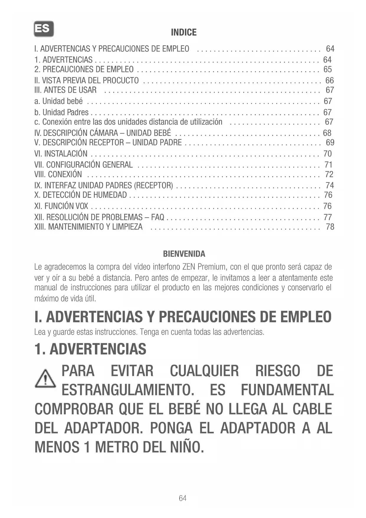 BIENVENIDA Le agradecemos la compra del vídeo interfono ZEN Premium, con el que pronto será capaz de ver y oír a su bebé a distancia. Pero antes de empezar, le invitamos a leer a atentamente este manual de instrucciones para utilizar el producto en las mejores condiciones y conservarlo el máximo de vida útil.