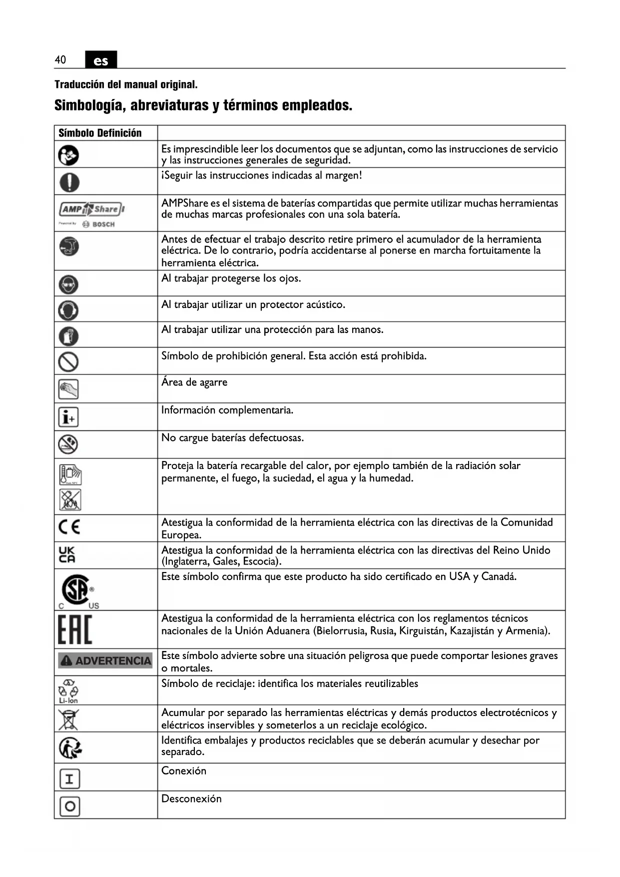 Traducción del manual original. Simbología, abreviaturas y términos empleados. Símbolo Definición Es imprescindible leer los documentos que se adjuntan, como las instrucciones de servicio y las instrucciones generales de seguridad. ¡Seguir las instrucciones indicadas al margen! AMPShare es el sistema de baterías compartidas que permite utilizar muchas herramientas de muchas marcas profesionales con una sola batería. Antes de efectuar el trabajo descrito retire primero el acumulador de la herramienta eléctrica. De lo contrario, podría accidentarse al ponerse en marcha fortuitamente la herramienta eléctrica. Al trabajar protegerse los ojos. Al trabajar utilizar un protector acústico. Al trabajar utilizar una protección para las manos. Símbolo de prohibición general. Esta acción está prohibida. Área de agarre Información complementaria. No cargue baterías defectuosas. Proteja la batería recargable del calor, por ejemplo también de la radiación solar permanente, el fuego, la suciedad, el agua y la humedad. Atestigua la conformidad de la herramienta eléctrica con las directivas de la Comunidad Europea. Atestigua la conformidad de la herramienta eléctrica con las directivas del Reino Unido (Inglaterra, Gales, Escocia). Este símbolo confirma que este producto ha sido certificado en USA y Canadá. Atestigua la conformidad de la herramienta eléctrica con los reglamentos técnicos nacionales de la Unión Aduanera (Bielorrusia, Rusia, Kirguistán, Kazajistán y Armenia). Este símbolo advierte sobre una situación peligrosa que puede comportar lesiones graves o mortales. Símbolo de reciclaje: identifica los materiales reutilizables Acumular por separado las herramientas eléctricas y demás productos electrotécnicos y eléctricos inservibles y someterlos a un reciclaje ecológico. Identifica embalajes y productos reciclables que se deberán acumular y desechar por separado. Conexión Desconexión max.50°C ADVERTENCIA41