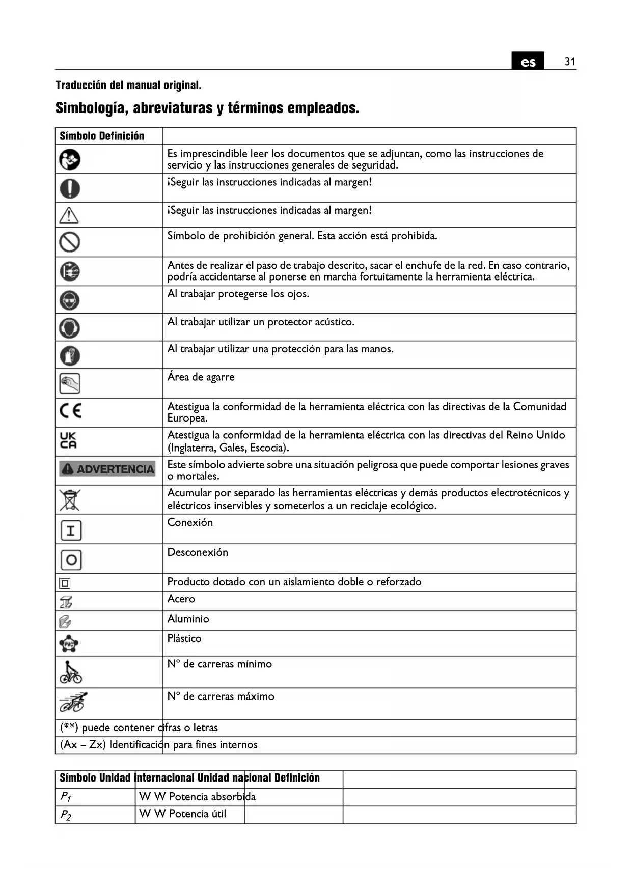Traducción del manual original. Simbología, abreviaturas y términos empleados. Símbolo Definición Es imprescindible leer los documentos que se adjuntan, como las instrucciones de servicio y las instrucciones generales de seguridad. ¡Seguir las instrucciones indicadas al margen! ¡Seguir las instrucciones indicadas al margen! Símbolo de prohibición general. Esta acción está prohibida. Antes de realizar el paso de trabajo descrito, sacar el enchufe de la red. En caso contrario, podría accidentarse al ponerse en marcha fortuitamente la herramienta eléctrica. Al trabajar protegerse los ojos. Al trabajar utilizar un protector acústico. Al trabajar utilizar una protección para las manos. Área de agarre Atestigua la conformidad de la herramienta eléctrica con las directivas de la Comunidad Europea. Atestigua la conformidad de la herramienta eléctrica con las directivas del Reino Unido (Inglaterra, Gales, Escocia). Este símbolo advierte sobre una situación peligrosa que puede comportar lesiones graves o mortales. Acumular por separado las herramientas eléctricas y demás productos electrotécnicos y eléctricos inservibles y someterlos a un reciclaje ecológico. Conexión Desconexión Producto dotado con un aislamiento doble o reforzado Acero Aluminio Plástico Nº de carreras mínimo Nº de carreras máximo (**) puede contener cifras o letras (Ax – Zx) Identificación para fines internos ADVERTENCIA Símbolo Unidad internacional Unidad nacional Definición