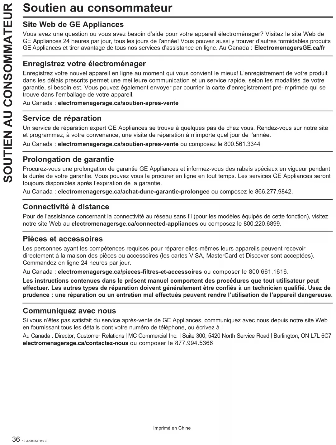 Producto no accesible para facilitar el servicio requerido. geappliances.com/extended-warranty o llamando al 800.626.2224 durante el horario comercial. Los Servicios para los GE Appliances aún estarán disponibles cuando su garantía caduque.36 49-3000353 Rev 3 Printed in China