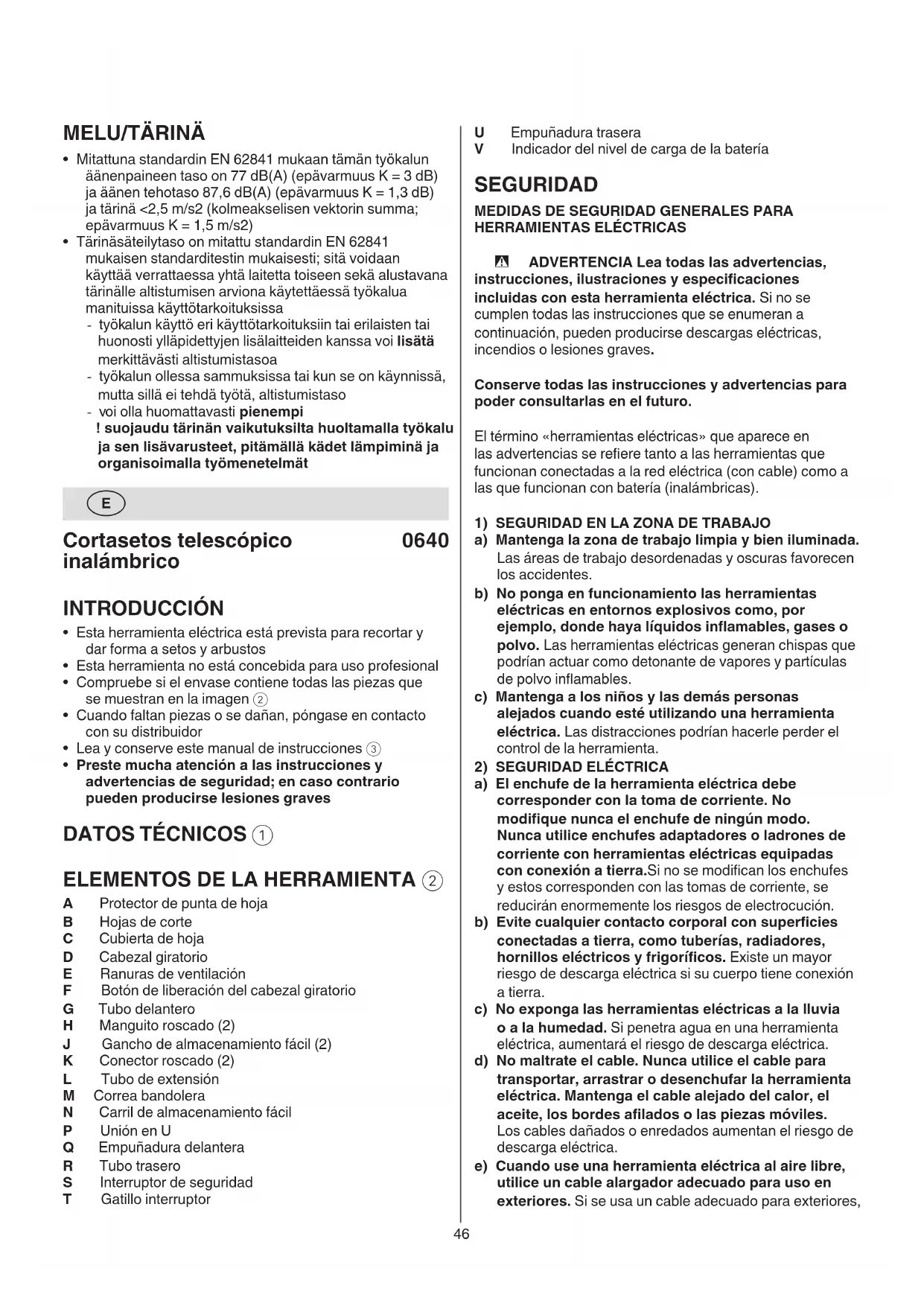 ELÉCTRICAS a) No fuerce la herramienta eléctrica. Utilice la herramienta eléctrica adecuada para la tarea que vaya a realizar. La herramienta correcta funcionará mejor y con más seguridad a la velocidad para la que ha sido diseñada. b) No use la herramienta si el interruptor no funciona para encenderla y apagarla. Toda herramienta que no se puede controlar con el interruptor es peligrosa y debe48 cerca de las mismas podría provocar lesiones graves o una descarga eléctrica con resultado mortal. b) Utilice el cortasetos telescópico siempre con las dos manos. Sujete el cortabordes de largo alcance con las dos manos para evitar perder el control. c) Lleve siempre protección en la cabeza cuando utilice el cortasetos telescópico en altura. La caída de residuos podría provocar lesiones graves.
