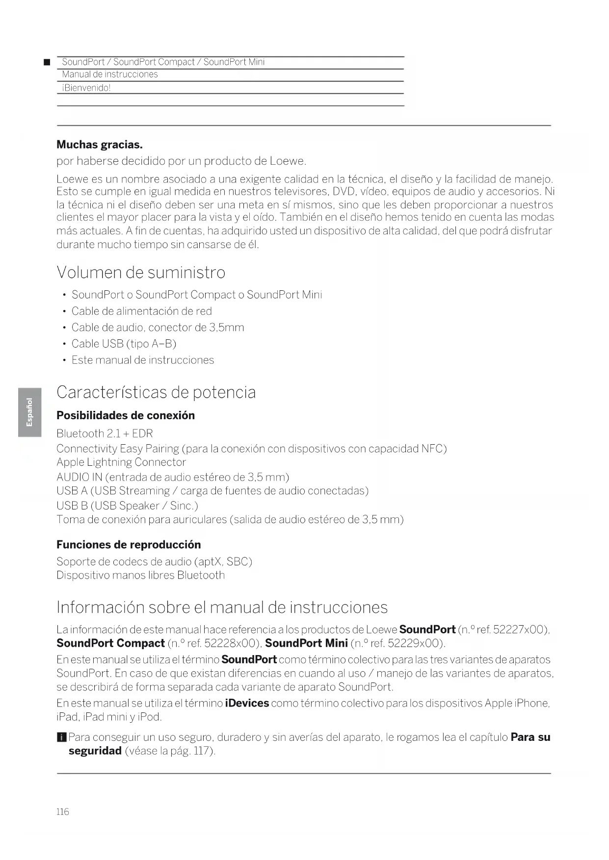 - Este manual de instrucciones Características de potencia Posibilidades de conexión Bluetooth 2.1 + EDR Connectivity Easy Pairing (para la conexión con dispositivos con capacidad NFC) Apple Lightning Connector AUDIO IN (entrada de audio estéreo de 3,5 mm) USB A (USB Streaming / carga de fuentes de audio conectadas) USB B (USB Speaker / Sinc.) Toma de conexión para auriculares (salida de audio estéreo de 3,5 mm) Funciones de reproducción Soporte de codecs de audio (aptX, SBC) Dispositivo manos libres Bluetooth Información sobre el manual de instrucciones La información de este manual hace referencia a los productos de Loewe SoundPort (n.º ref. 52227x00), SoundPort Compact (n.º ref. 52228x00), SoundPort Mini (n.º ref. 52229x00). En este manual se utiliza el término SoundPort como término colectivo para las tres variantes de aparatos SoundPort. En caso de que existan diferencias en cuando al uso / manejo de las variantes de aparatos, se describirá de forma separada cada variante de aparato SoundPort. En este manual se utiliza el término iDevices como término colectivo para los dispositivos Apple iPhone, iPad, iPad mini y iPod. Para conseguir un uso seguro, duradero y sin averías del aparato, le rogamos lea el capítulo Para su seguridad (véase la pág. 117).SoundPort / SoundPort Compact / SoundPort Mini Manual de instrucciones Español