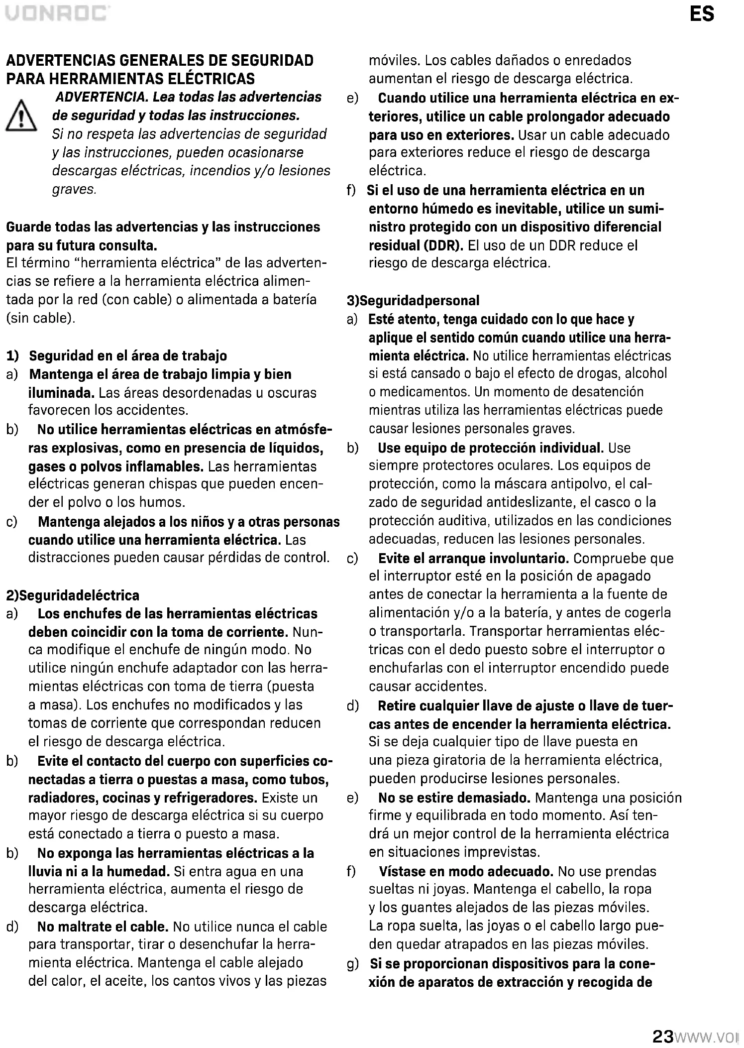 - Si se han utilizado piezas de repuesto no origi- nales. Esta constituye la única garantía, expresa e implícita, ofrecida por la empresa. No existen otras garantías expresas o implícitas distintas a la especificada en el presente documento, incluidas las garantías implícitas de comerciabilidad y de adecuación a un propósito particular. VONROC no será responsable bajo ninguna circunstancia de ningún daño incidental o consecuente. Los recursos de los distribuidores están limitados a la reparación o sustitución de las unidades o piezas no conformes. El producto y el manual de usuario están sujetos a variaciones. Las especificaciones pueden variarse sin aviso previo.