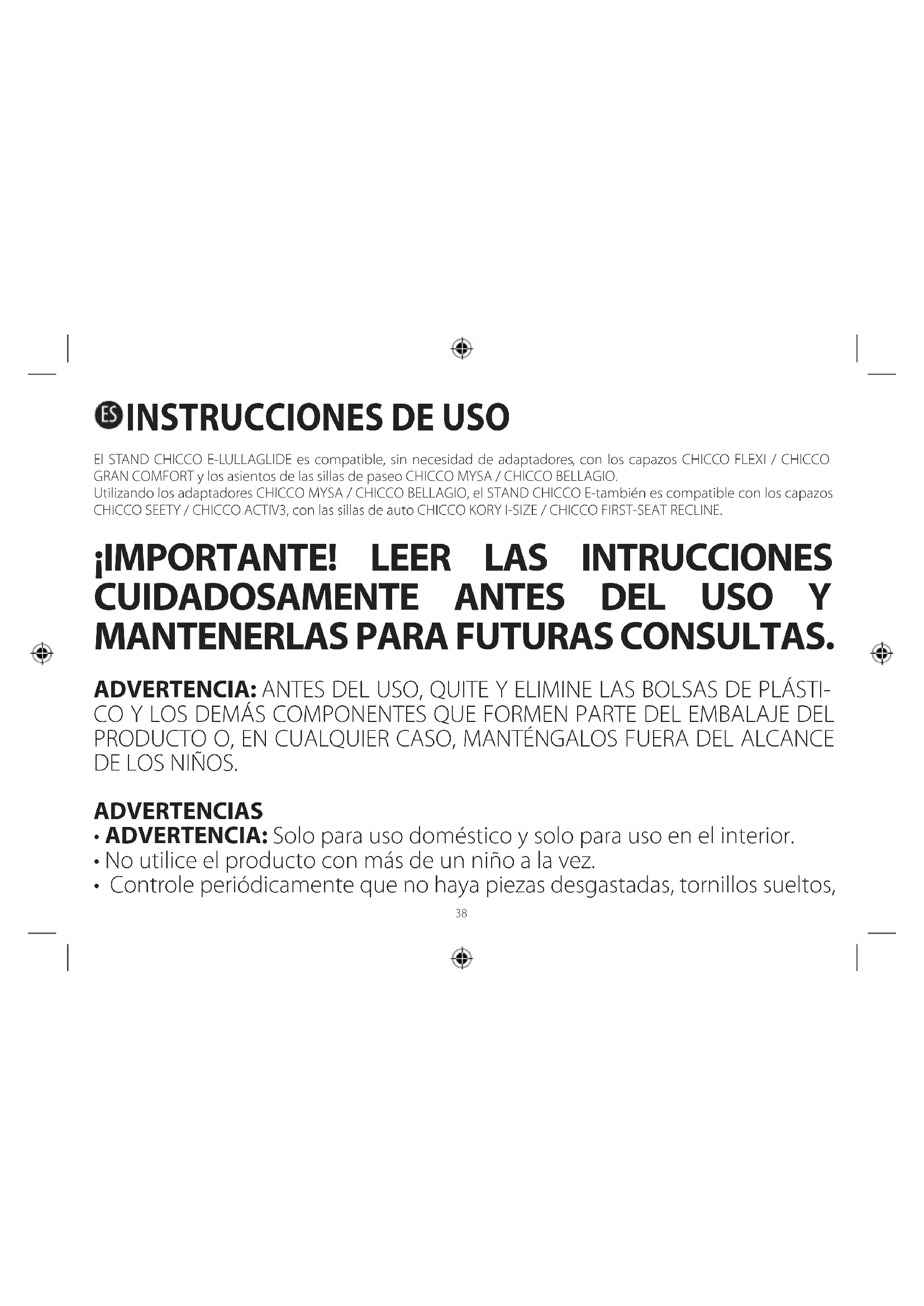 - ADVERTENCIA: El STAND CHICCO E-LULLAGLIDE se puede utilizar con los asientos CHICCO MYSA / CHICCO BELLAGIO solo con el respaldo en posición totalmente en vertical o en posición intermedia.