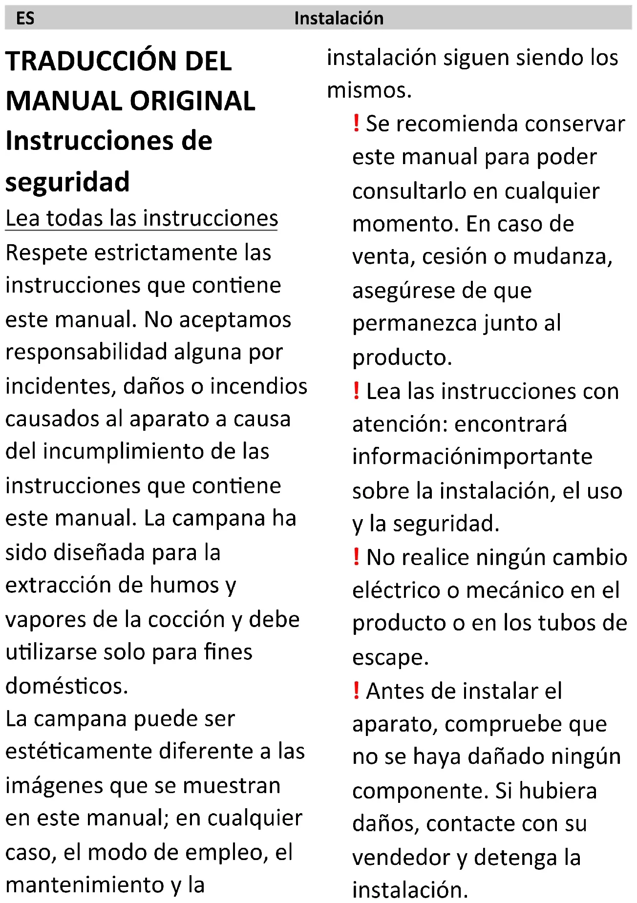 MANUAL ORIGINAL Instrucciones de seguridad Lea todas las instrucciones Respete estrictamente las instrucciones que contiene este manual. No aceptamos responsabilidad alguna por incidentes, daños o incendios causados al aparato a causa del incumplimiento de las instrucciones que contiene este manual. La campana ha sido diseñada para la extracción de humos y vapores de la cocción y debe utilizarse solo para fines domésticos. La campana puede ser estéticamente diferente a las imágenes que se muestran en este manual; en cualquier caso, el modo de empleo, el mantenimiento y la instalación siguen siendo los mismos. ! Se recomienda conservar este manual para poder consultarlo en cualquier momento. En caso de venta, cesión o mudanza, asegúrese de que permanezca junto al producto. ! Lea las instrucciones con atención: encontrará informaciónimportante sobre la instalación, el uso y la seguridad. ! No realice ningún cambio eléctrico o mecánico en el producto o en los tubos de escape. ! Antes de instalar el aparato, compruebe que no se haya dañado ningún componente. Si hubiera daños, contacte con su vendedor y detenga la instalación.ES