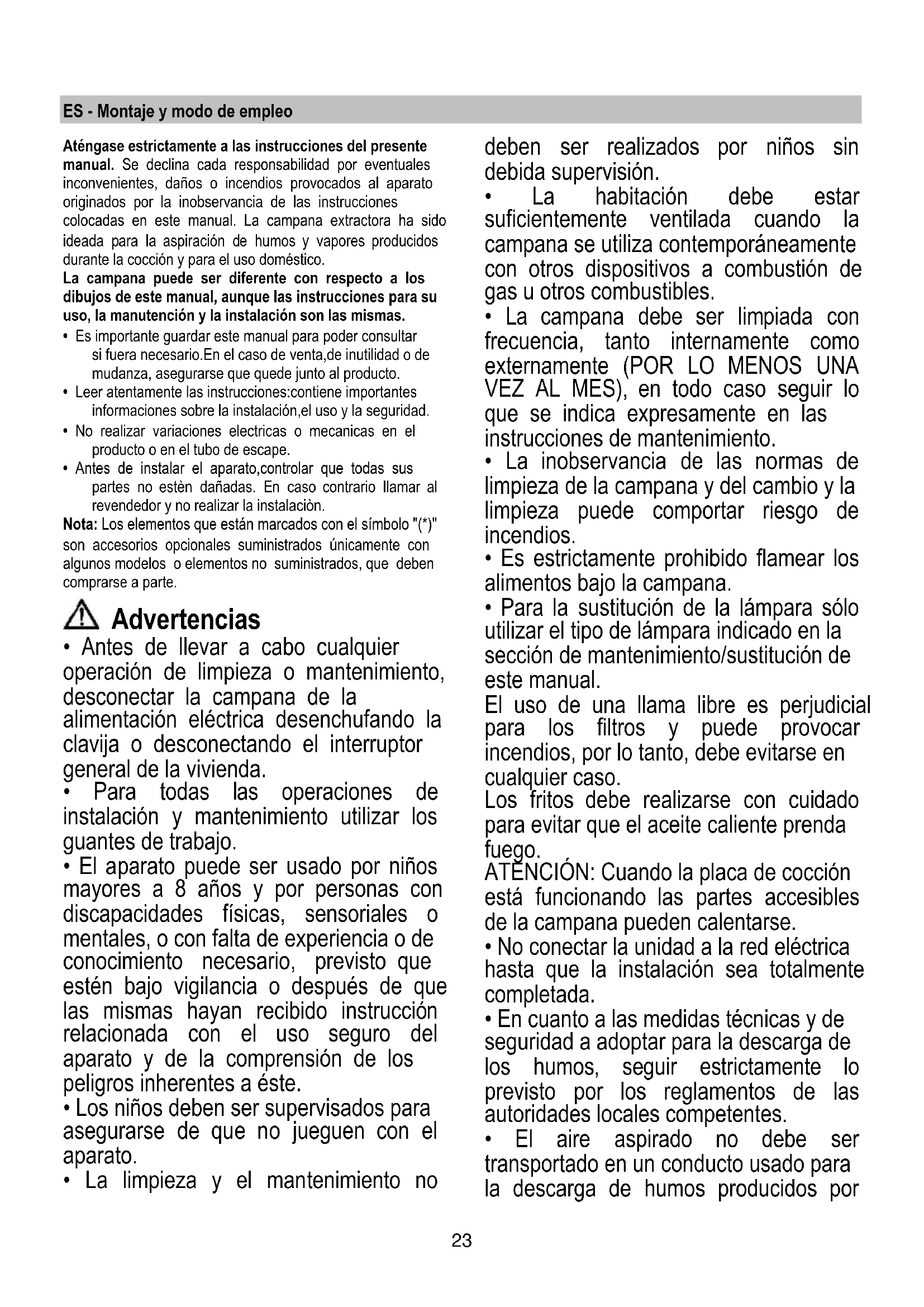 - Para la sustitución de la lámpara sólo utilizar el tipo de lámpara indicado en la sección de mantenimiento/sustitución de este manual. El uso de una llama libre es perjudicial para los filtros y puede provocar incendios, por lo tanto, debe evitarse en cualquier caso. Los fritos debe realizarse con cuidado para evitar que el aceite caliente prenda fuego. ATENCIÓN: Cuando la placa de cocción está funcionando las partes accesibles de la campana pueden calentarse.