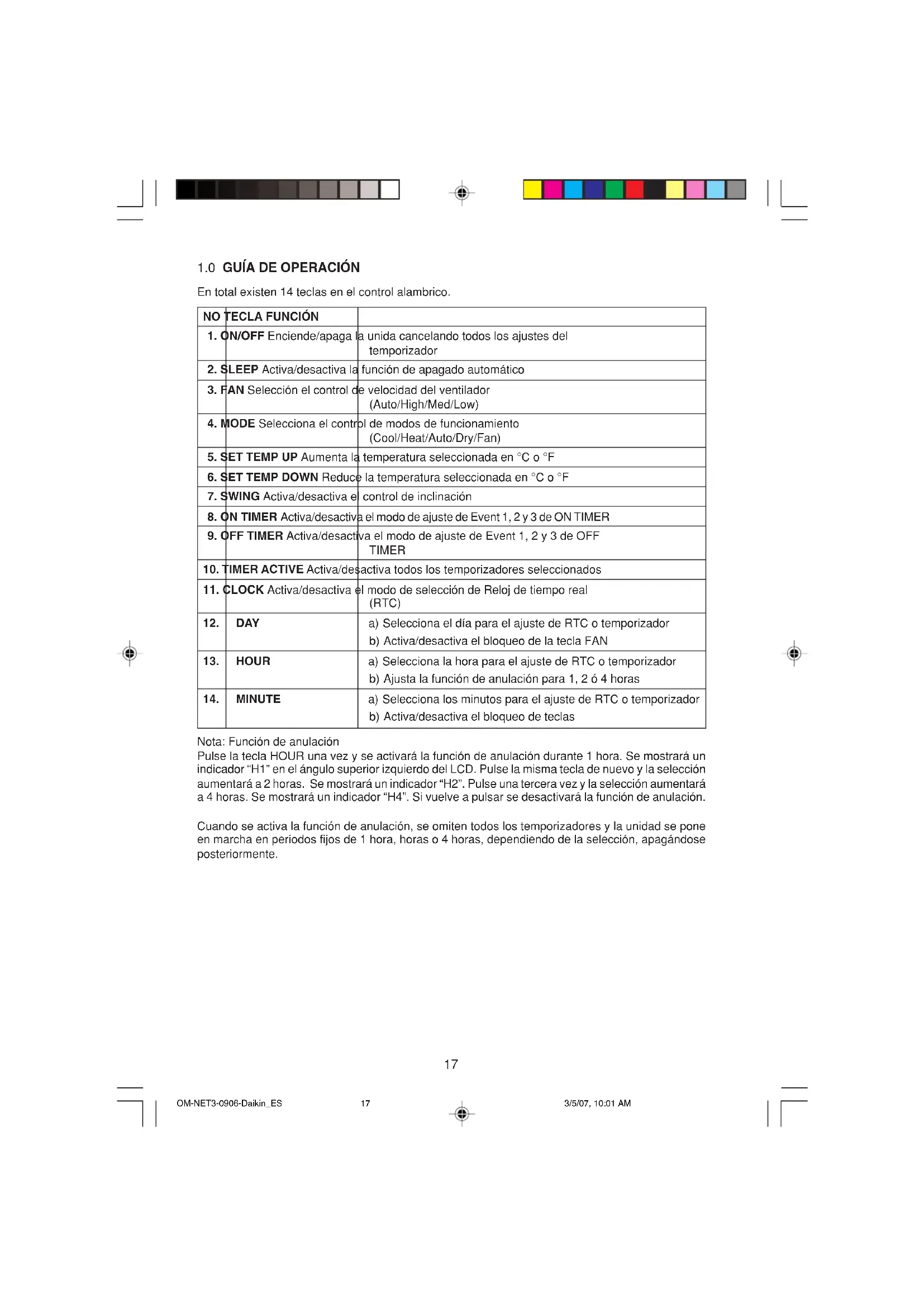 En total existen 14 teclas en el control alambrico. Nota: Función de anulación Pulse la tecla HOUR una vez y se activará la función de anulación durante 1 hora. Se mostrará un indicador “H1” en el ángulo superior izquierdo del LCD. Pulse la misma tecla de nuevo y la selección aumentará a 2 horas. Se mostrará un indicador “H2”. Pulse una tercera vez y la selección aumentará a 4 horas. Se mostrará un indicador “H4”. Si vuelve a pulsar se desactivará la función de anulación. Cuando se activa la función de anulación, se omiten todos los temporizadores y la unidad se pone en marcha en periodos fijos de 1 hora, horas o 4 horas, dependiendo de la selección, apagándose posteriormente. OM-NET3-0906-Daikin_ES 3/5/07, 10:01 AM1718