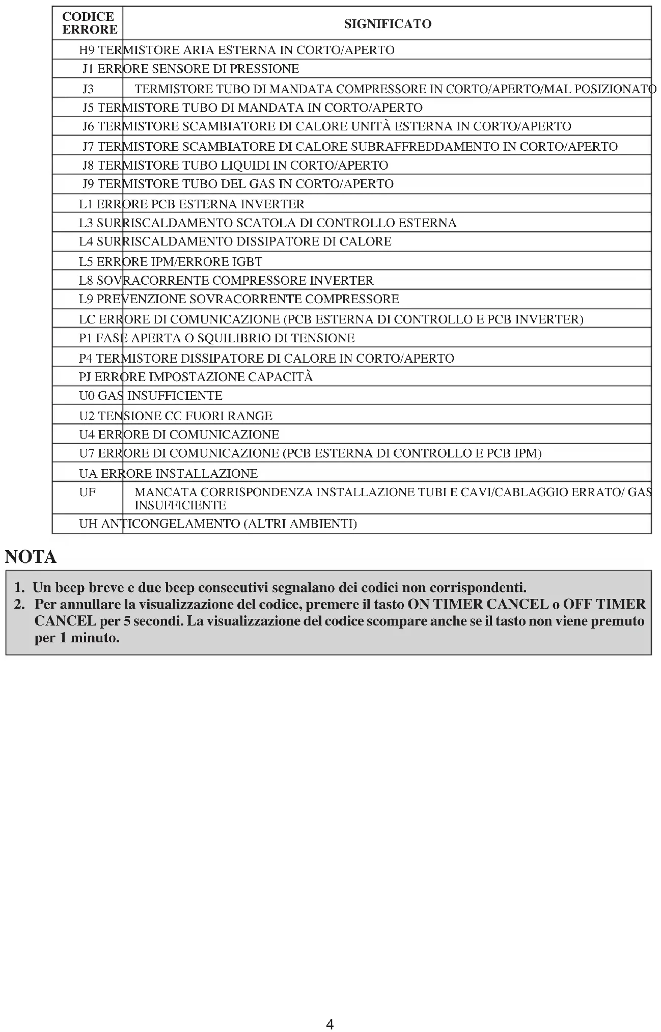 (CANCELACIÓN DE ENCENDIDO DEL TEMPORIZADOR) o el botón de OFF TIMER CANCEL (CANCELACIÓN DE APAGADO DEL TEMPORIZADOR) durante 5 segundos. La exhibición del código también se cancela por si misma si el botón no se presiona durante 1 minuto. NOTA