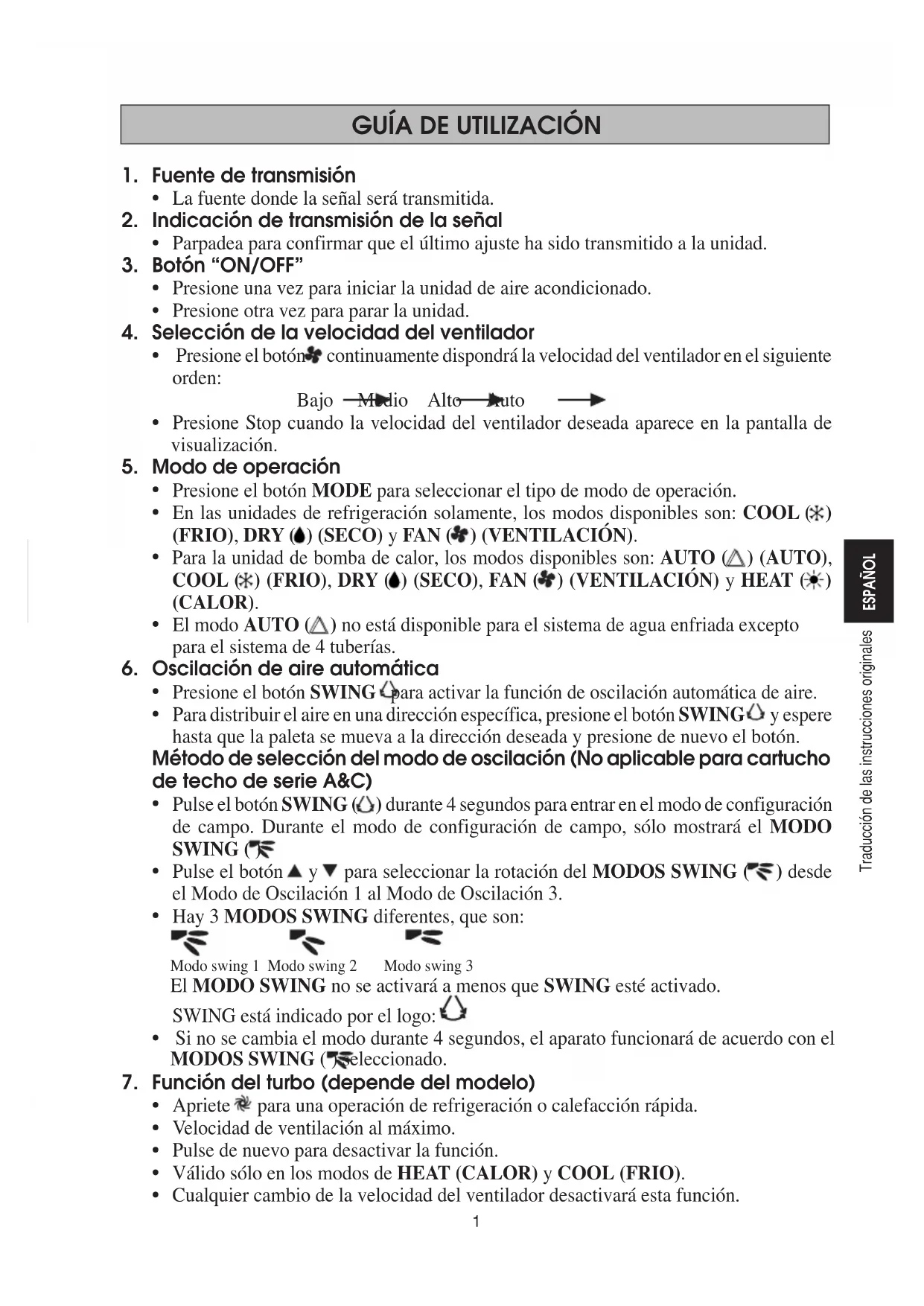 Fuente de transmisión La fuente donde la señal será transmitida. Indicación de transmisión de la señal Parpadea para confirmar que el último ajuste ha sido transmitido a la unidad. Botón “ON/OFF” Presione una vez para iniciar la unidad de aire acondicionado. Presione otra vez para parar la unidad. Selección de la velocidad del ventilador Presione el botón continuamente dispondrá la velocidad del ventilador en el siguiente orden: Bajo Medio Alto Auto Presione Stop cuando la velocidad del ventilador deseada aparece en la pantalla de visualización. Modo de operación Presione el botón MODE para seleccionar el tipo de modo de operación. En las unidades de refrigeración solamente, los modos disponibles son: COOL ( ) (FRIO), DRY ( ) (SECO) y FAN ( ) (VENTILACIÓN). Para la unidad de bomba de calor, los modos disponibles son: AUTO ( ) (AUTO), COOL ( ) (FRIO), DRY ( ) (SECO), FAN ( ) (VENTILACIÓN) y HEAT ( ) (CALOR). El modo AUTO ( ) no está disponible para el sistema de agua enfriada excepto para el sistema de 4 tuberías. Oscilación de aire automática Presione el botón SWING para activar la función de oscilación automática de aire. Para distribuir el aire en una dirección específica, presione el botón SWING y espere hasta que la paleta se mueva a la dirección deseada y presione de nuevo el botón. Método de selección del modo de oscilación (No aplicable para cartucho de techo de serie A&C) Pulse el botón SWING ( ) durante 4 segundos para entrar en el modo de configuración de campo. Durante el modo de configuración de campo, sólo mostrará el MODO SWING ( ). Pulse el botón y para seleccionar la rotación del MODOS SWING ( ) desde el Modo de Oscilación 1 al Modo de Oscilación 3. Hay 3 MODOS SWING diferentes, que son: Modo swing 1 Modo swing 2 Modo swing 3 El MODO SWING no se activará a menos que SWING esté activado. SWING está indicado por el logo: Si no se cambia el modo durante 4 segundos, el aparato funcionará de acuerdo con el MODOS SWING ( ) seleccionado. Función del turbo (depende del modelo) Apriete para una operación de refrigeración o calefacción rápida. Velocidad de ventilación al máximo. Pulse de nuevo para desactivar la función. Válido sólo en los modos de HEAT (CALOR) y COOL (FRIO). Cualquier cambio de la velocidad del ventilador desactivará esta función.