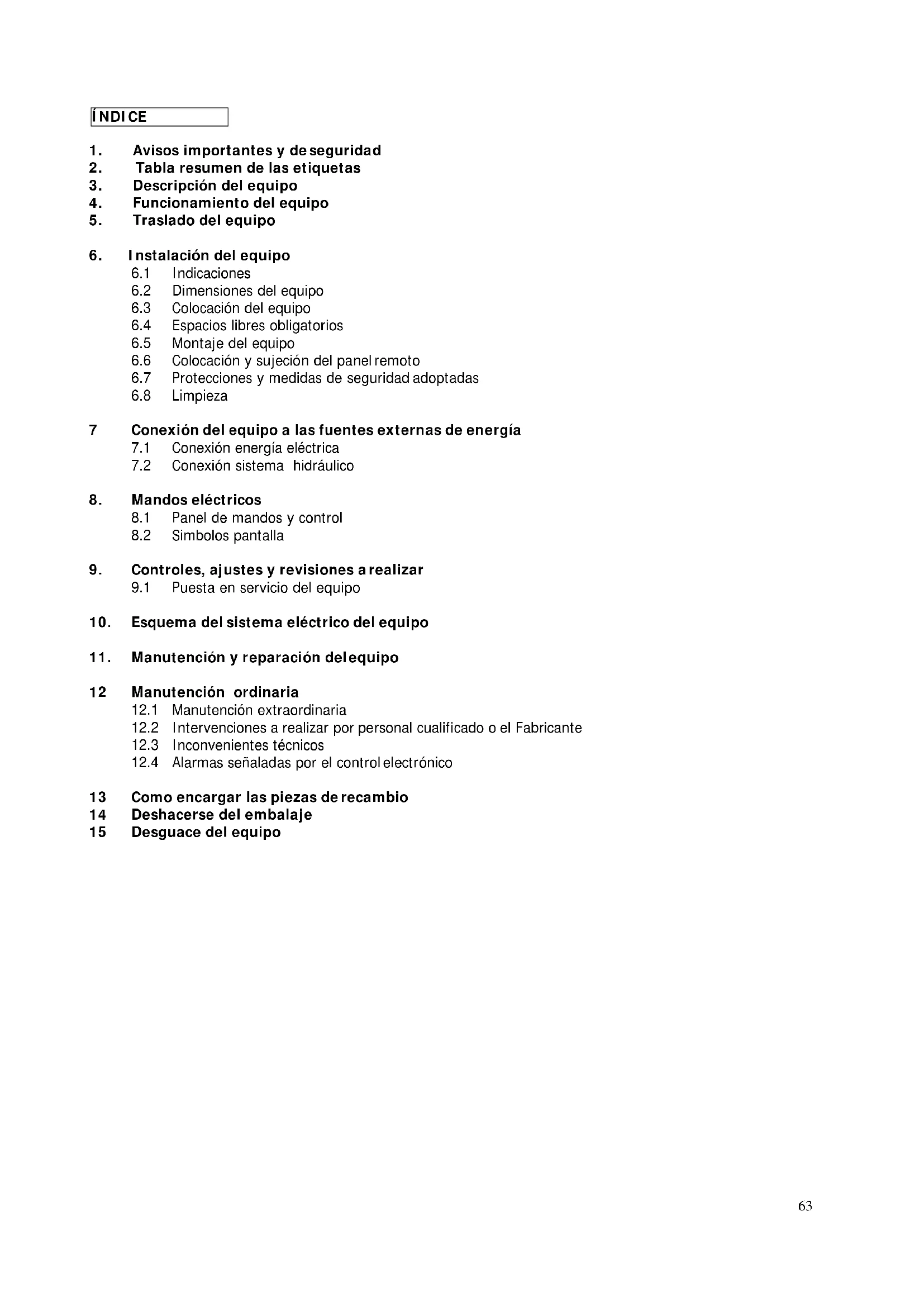 Desguace del equipo ÍNDICE Á64 Deseamos agradecerle la confianza que ha depositado en nosotros al adquirir un producto Uniblock. Le rogamos que lea atentamente este manual, preparado expresamente, con consejos y avisos sobre el correcto modo de instalación, uso y manutención de nuestro producto, para que pueda sacar el máximo provecho de todas sus características. 1 Avisos importantes y de seguridad A continuación recogemos algunos consejos, relativos a la seguridad, a seguir durante la instalación y el uso del equipo. La instalación del equipo se tiene que realizar conforme a los esquemas y los consejos proporcionados por el Fabricante. Los daños debidos a conexiones impropias están excluidos. No se admite un conductor neutro como conductor de protección, aunque sea de tierra. La instalación eléctrica del entorno en donde se instala el equipo tiene que ser conforme a las normas vigentes para las instalaciones eléctricas. La manutención del equipo debe ser realizada por personal cualificado o el Fabricante, siguiendo todas las disposiciones previstas por la normativa EN378. AVISO Para evitar cortes en las manos, use guantes de protección Para cualquier empleo no previsto del equipo, en especial durante su uso, o de todas formas para cualquier intervención que se quiera realizar en el equipo, el Usuario está obligado a informarse a través del Fabricante sobre eventuales contraindicaciones o peligros que se podrían deber a un uso improprio de dicho equipo. El equipo debe utilizarse conforme a las instrucciones de uso y para los usos previstos por el Fabricante. Cualquier uso incorrecto del equipo representa una condición anómala y puede provocar daños al equipo mismo y constituir un serio peligro para la salud de las personas. CUIDADO Este equipo no ha sido construido para trabajar en un entorno explosivo. Por lo tanto, queda terminantemente prohibido usar el equipo en atmósferas con peligro de explosión.