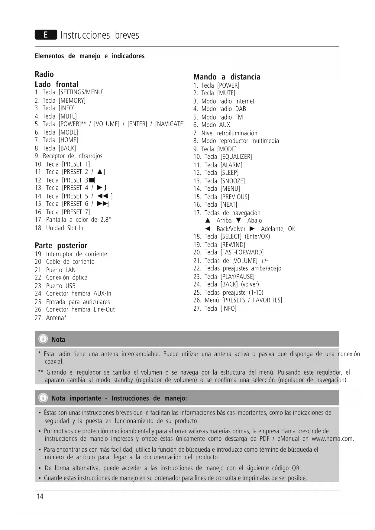 - Esta radio tiene una antena intercambiable. Puede utilizar una antena activa o pasiva que disponga de una conexión coaxial. ** Girando el regulador se cambia el volumen o se navega por la estructura del menú. Pulsando este regulador, el aparato cambia al modo standby (regulador de volumen) o se conrma una selección (regulador de navegación). Nota importante - Instrucciones de manejo: