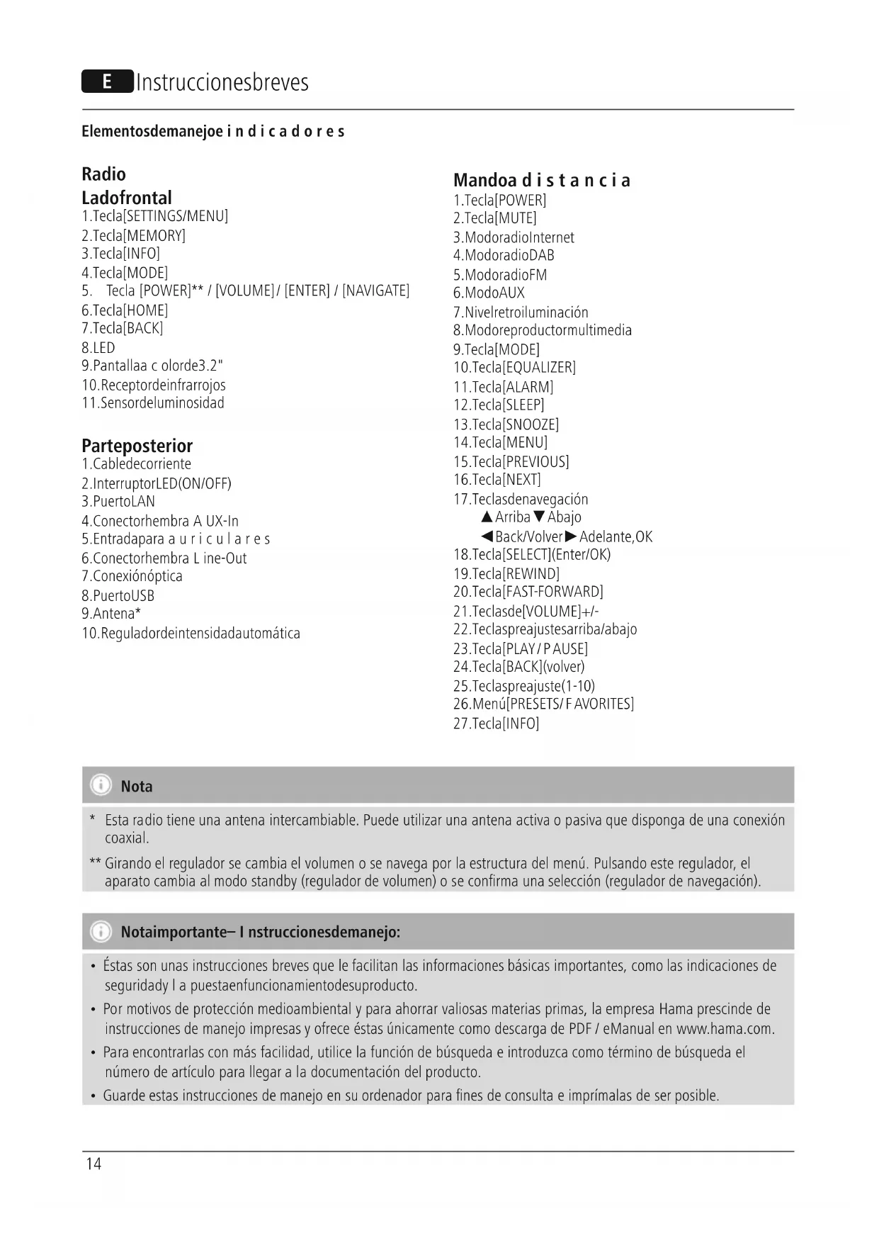 Nota *Esta radio tiene una antena intercambiable. Puede utilizar una antena activa opasiva que disponga de una conexión coaxial. ** Girando el regulador se cambia el volumen osenavega por la estructuradel menú. Pulsando este regulador,el aparato cambia al modo standby (regulador de volumen) oseconrma una selección (regulador de navegación). Nota importante –Instrucciones de manejo: