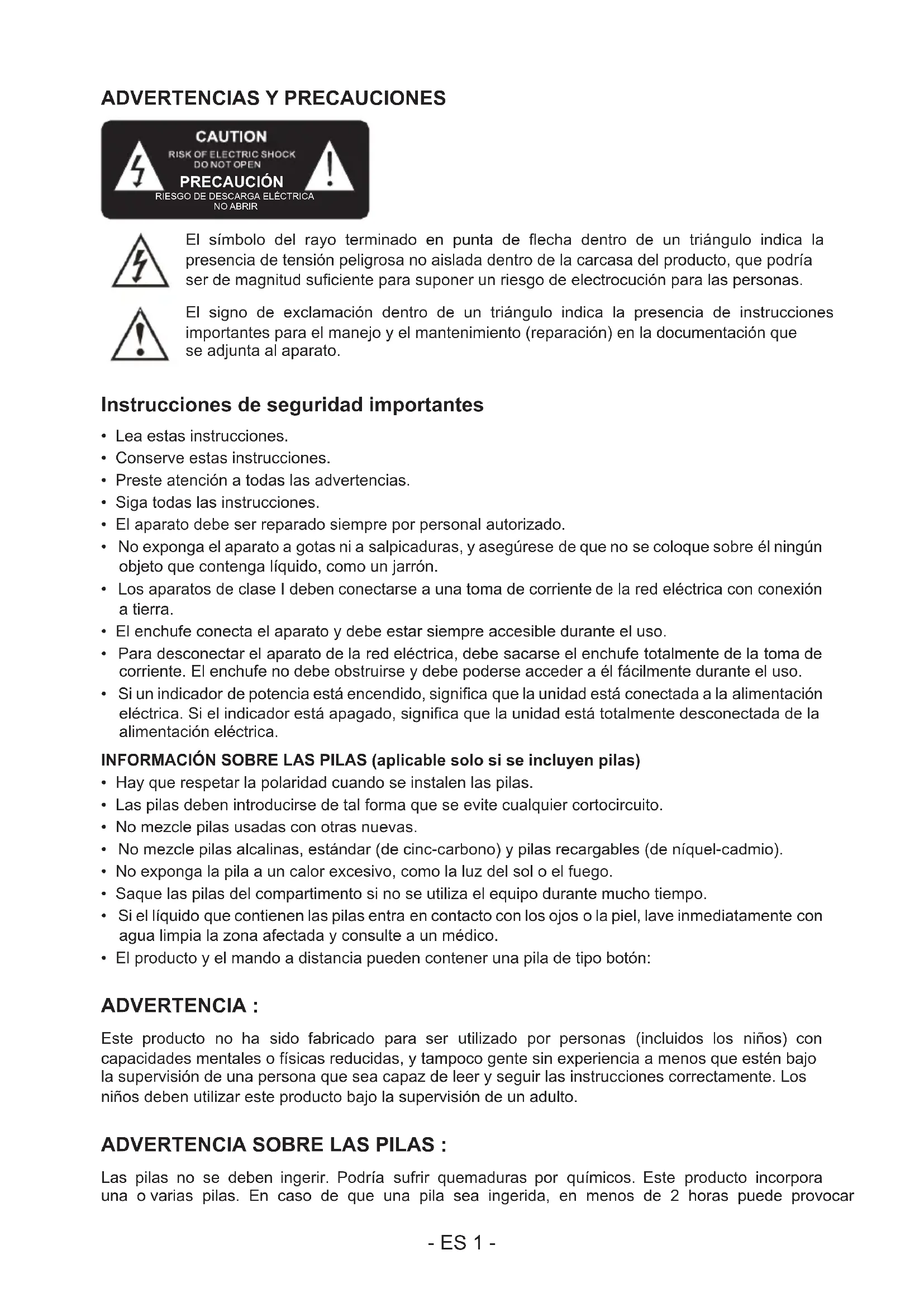 - El producto y el mando a distancia pueden contener una pila de tipo botón: ADVERTENCIA : Este producto no ha sido fabricado para ser utilizado por personas (incluidos los niños) con capacidades mentales o físicas reducidas, y tampoco gente sin experiencia a menos que estén bajo la supervisión de una persona que sea capaz de leer y seguir las instrucciones correctamente. Los niños deben utilizar este producto bajo la supervisión de un adulto. ADVERTENCIA SOBRE LAS PILAS : Las pilas no se deben ingerir. Podría sufrir quemaduras por químicos. Este producto incorpora una o varias pilas. En caso de que una pila sea ingerida, en menos de 2 horas puede provocar- ES 2 - lesiones internas graves y la muerte. Mantenga las pilas nuevas y usadas fuera del alcance de los niños y personas vulnerables. En caso de que el compartimento de las pilas no pueda ser cerrado correctamente, no vuelva a utilizar el producto. Si se ingiere una pila, acuda al médico inmediatamente. OBSERVACIONES IMPORTANTES : La/s pila/s podría/n explotar si no se instalan correctamente o si el producto no se utiliza durante un largo periodo de tiempo con las pilas en el interior. Sustituya las pilas usadas por pilas idénticas o de un modelo similar. Aislamiento doble Corriente continua Corriente alterna Símbolo de uso en interiores Cuidado del medioambiente Este producto está diseñado y fabricado con materiales y componentes de alta calidad que pueden reciclarse o reutilizarse. Este producto contiene pilas que cumplen con la Directiva europea 2006/66/CE y que no se pueden desechar junto con la basura doméstica. Infórmese sobre la normativa local relacionada con la recolección separada de pilas usadas ya que al eliminarse de forma correcta se evitan consecuencias negativas sobre el medioambiente y la salud humana. Cuando el producto posee el símbolo de un contenedor con ruedas tachado signica que se encuentra conforme con la Directiva europea 2002/96/CE. Infórmese sobre el sistema local de recolección separado de productos eléctricos y electrónicos. Siga la normativa local y no deseche los productos usados junto con los residuos domésticos. Una eliminación correcta de este producto ayuda a evitar las consecuencias negativas para el medioambiente y la salud humana. Cumplimiento Este producto cumple los requisitos de interferencias de radio de la Comunidad Europea. El aparato incluye esta etiqueta.- ES 3 - Alimentación por pilas: