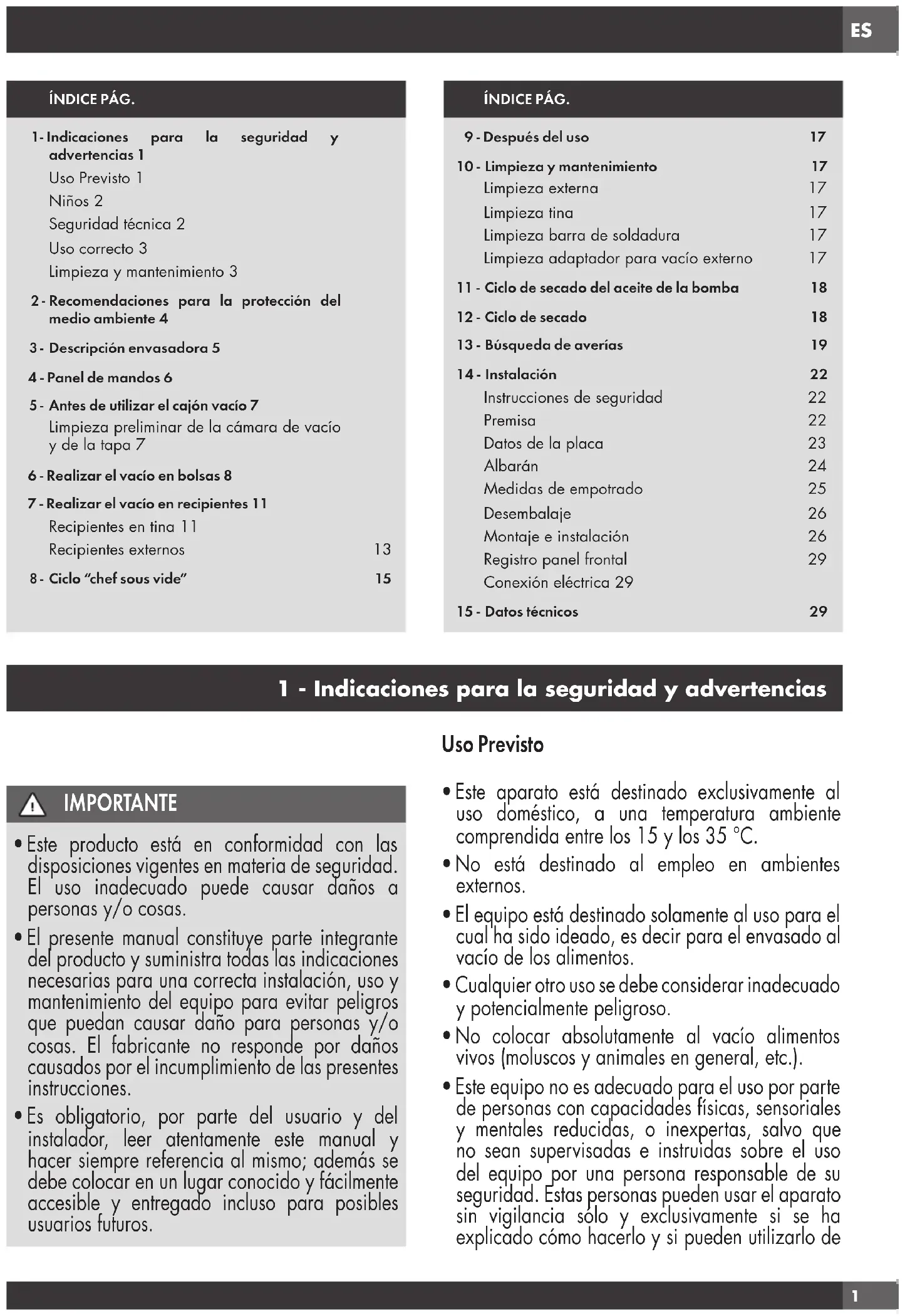 Instrucciones de seguridad El presente manual constituye parte integrante del producto y suministra todas las indicaciones necesarias para una correcta instalación y mantenimiento de la máquina. ATENCIÓN Es obligatorio, por parte del usuario y del instalador, leer atentamente este manual y hacer siempre referencia al mismo; además se debe conservar en lugar conocido y accesible por todos los operadores autorizados (instalador, usuario, encargado del mantenimiento). El aparato está destinado sólo al uso para el cual ha sido creado, es decir para el envasado al vacío de los alimentos. Cualquier otro uso se debe considerar inadecuado y potencialmente peligroso. La empresa fabricante declina toda responsabilidad y toda obligación de garantía, en caso que se verifiquen daños a los aparatos, a las personas y a las cosas, imputables a: