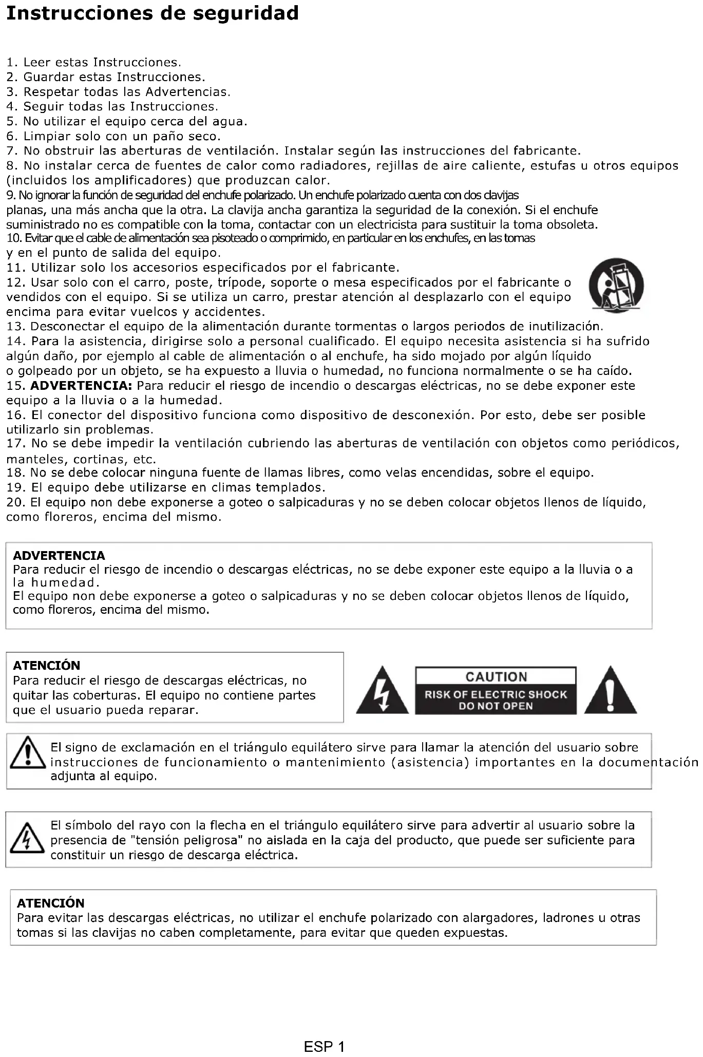 20. El equipo non debe exponerse a goteo o salpicaduras y no se deben colocar objetos llenos de líquido,