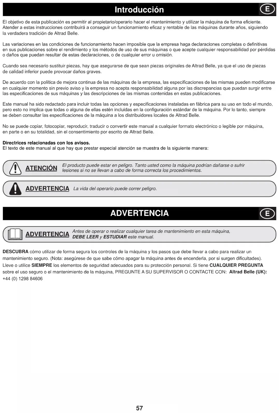 E58 Números de serie ASEGÚRESE de anotar los números de serie de su máquina y citarlos siempre en cualquier comunicación con Altrad Belle o con uno de nuestros distribuidores. A - NÚMERO DE SERIE DE LA MÁQUINA B - NÚMERO DE SERIE DE LA UNIDAD DE ALIMENTACIÓN Made In United Kingdom by: Altrad Belle Ltd. Sheen, Nr. Buxton, Derbyshire, SK17 0EU+44 (0)1298 84606+44 (0)1298 84722sales@altrad-belle.comwww.Altrad-Belle.com www