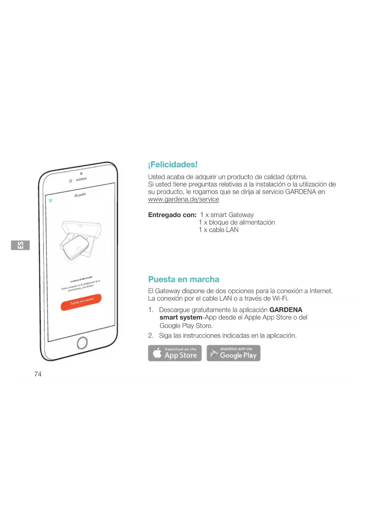 ¡Felicidades! Usted acaba de adquirir un producto de calidad óptima. Si usted tiene preguntas relativas a la instalación o la utilización de su producto, le rogamos que se dirija al servicio GARDENA en www.gardena.de/service Entregado con: 1 x smart Gateway 1 x bloque de alimentación 1 x cable LAN Puesta en marcha El Gateway dispone de dos opciones para la conexión a Internet. La conexión por el cable LAN o a través de Wi-Fi.