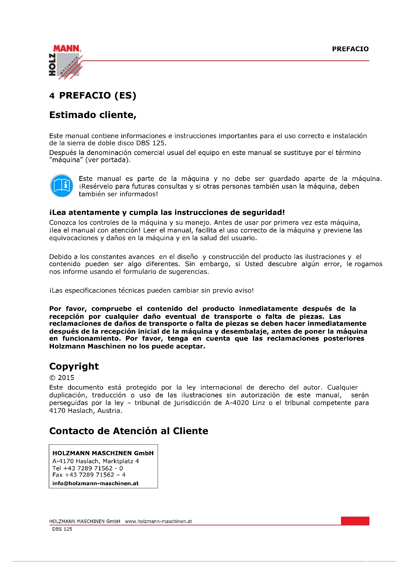 (poignée frontale) 2,787 m/s² K: 1,5 m/s²PREFACIO HOLZMANN MASCHINEN GmbH www.holzmann-maschinen.at Página 8 DBS 125 4 PREFACIO (ES) Estimado cliente, Este manual contiene informaciones e instrucciones importantes para el uso correcto e instalación de la sierra de doble disco DBS 125. Después la denominación comercial usual del equipo en este manual se sustituye por el término "máquina" (ver portada). Este manual es parte de la máquina y no debe ser guardado aparte de la máquina. ¡Resérvelo para futuras consultas y si otras personas también usan la máquina, deben también ser informados! ¡Lea atentamente y cumpla las instrucciones de seguridad! Conozca los controles de la máquina y su manejo. Antes de usar por primera vez esta máquina, ¡lea el manual con atención! Leer el manual, facilita el uso correcto de la máquina y previene las equivocaciones y daños en la máquina y en la salud del usuario. Debido a los constantes avances en el diseño y construcción del producto las ilustraciones y el contenido pueden ser algo diferentes. Sin embargo, si Usted descubre algún error, le rogamos nos informe usando el formulario de sugerencias. ¡Las especificaciones técnicas pueden cambiar sin previo aviso! Por favor, compruebe el contenido del producto inmediatamente después de la recepción por cualquier daño eventual de transporte o falta de piezas. Las reclamaciones de daños de transporte o falta de piezas se deben hacer inmediatamente después de la recepción inicial de la máquina y desembalaje, antes de poner la máquina en funcionamiento. Por favor, tenga en cuenta que las reclamaciones posteriores Holzmann Maschinen no los puede aceptar. Copyright © 2015 Este documento está protegido por la ley internacional de derecho del autor. Cualquier duplicación, traducción o uso de las ilustraciones sin autorización de este manual, serán perseguidas por la ley – tribunal de jurisdicción de A-4020 Linz o el tribunal competente para 4170 Haslach, Austria. Contacto de Atención al Cliente