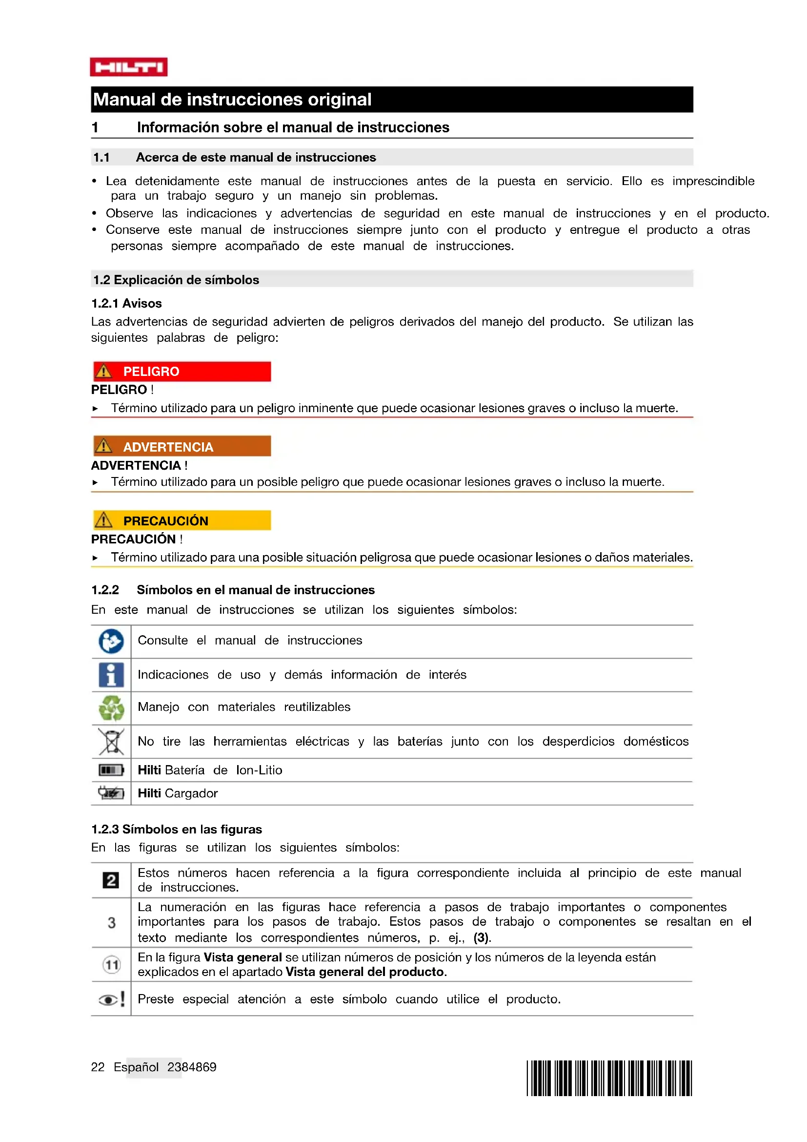 En este manual de instrucciones se utilizan los siguientes símbolos: Consulte el manual de instrucciones Indicaciones de uso y demás información de interés Manejo con materiales reutilizables No tire las herramientas eléctricas y las baterías junto con los desperdicios domésticos Hilti Batería de Ion-Litio Hilti Cargador