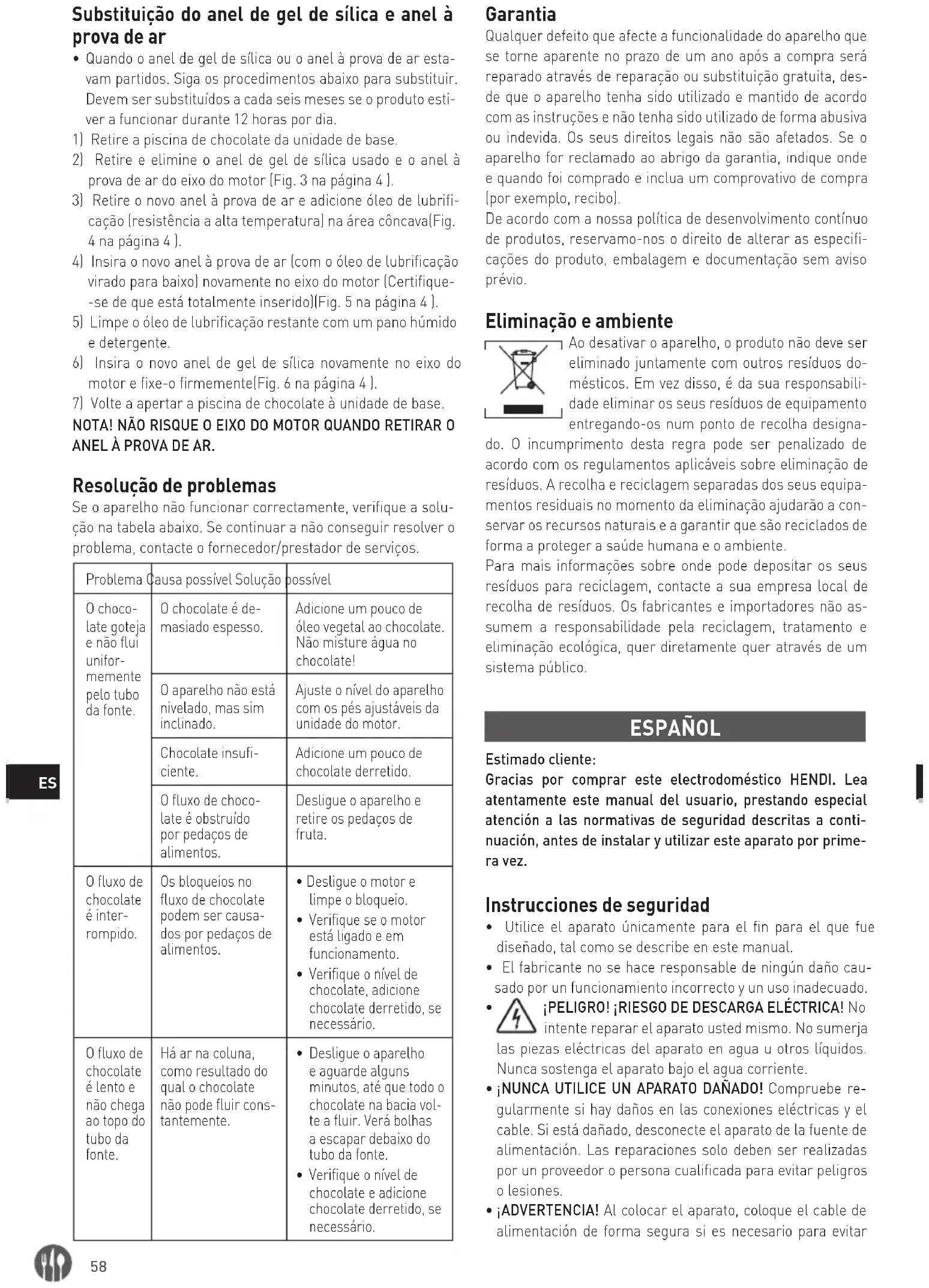 Compruebe el nivel de chocolate y añada chocolate derretido si es necesario. Garantía Cualquier defecto que afecte a la funcionalidad del aparato que se haga evidente en el plazo de un año desde la compra se reparará o sustituirá gratuitamente siempre que el aparato se haya utilizado y mantenido de acuerdo con las instruccio- nes y no se haya abusado o utilizado indebidamente de nin- guna manera. Sus derechos legales no se ven afectados. Si el aparato se reclama bajo garantía, indique dónde y cuándo se compró e incluya la prueba de compra (p. ej., recibo). De acuerdo con nuestra política de desarrollo continuo de productos, nos reservamos el derecho de cambiar las espe- cificaciones del producto, el embalaje y la documentación sin previo aviso. Descarte y medio ambiente Al desmontar el aparato, el producto no debe desecharse junto con otros residuos domésti- cos. En su lugar, es su responsabilidad des- echar el equipo de desecho entregándolo a un punto de recogida designado. El incumplimiento de esta norma puede ser penalizado de acuerdo con las nor- mativas aplicables sobre eliminación de residuos. L recogida y el reciclaje separados de sus equipos de desecho en el mo- mento de su eliminación ayudarán a conservar los recursos naturales y garantizarán que se reciclen de una manera que62