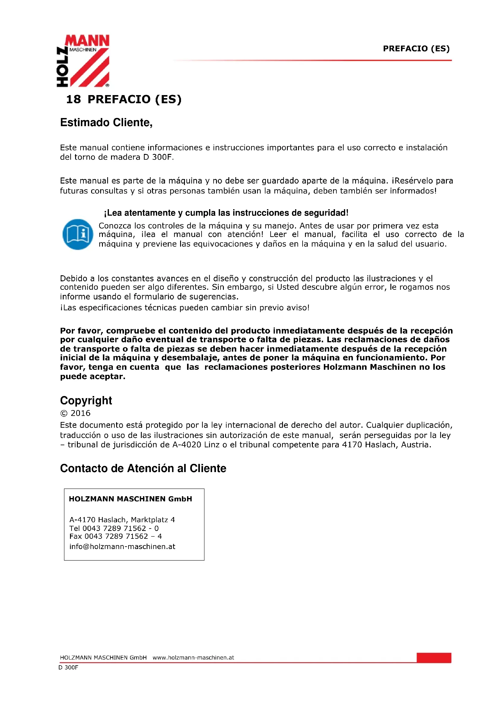 Should you in necessary repairs not able to properly to perform or you have not the prescribed training for it always attract a workshop to fix the problem.PREFACIO (ES) HOLZMANN MASCHINEN GmbH www.holzmann-maschinen.at 32 D 300F 18 PREFACIO (ES) Estimado Cliente, Este manual contiene informaciones e instrucciones importantes para el uso correcto e instalación del torno de madera D 300F. Este manual es parte de la máquina y no debe ser guardado aparte de la máquina. ¡Resérvelo para futuras consultas y si otras personas también usan la máquina, deben también ser informados! ¡Lea atentamente y cumpla las instrucciones de seguridad! Conozca los controles de la máquina y su manejo. Antes de usar por primera vez esta máquina, ¡lea el manual con atención! Leer el manual, facilita el uso correcto de la máquina y previene las equivocaciones y daños en la máquina y en la salud del usuario.